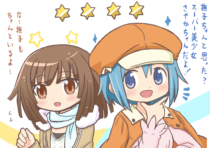 2girls :d bad_id bad_pixiv_id blue_eyes blue_hair brown_eyes brown_hair newsboy_cap commentary_request cosplay crossover hand_up hat jacket long_hair long_sleeves looking_at_viewer magia_record:_mahou_shoujo_madoka_magica_gaiden mahou_shoujo_madoka_magica miki_sayaka monogatari_(series) multiple_girls open_mouth orange_hat orange_jacket reverse_(bluefencer) sengoku_nadeko sengoku_nadeko_(cosplay) short_hair smile star_(symbol) translation_request upper_body