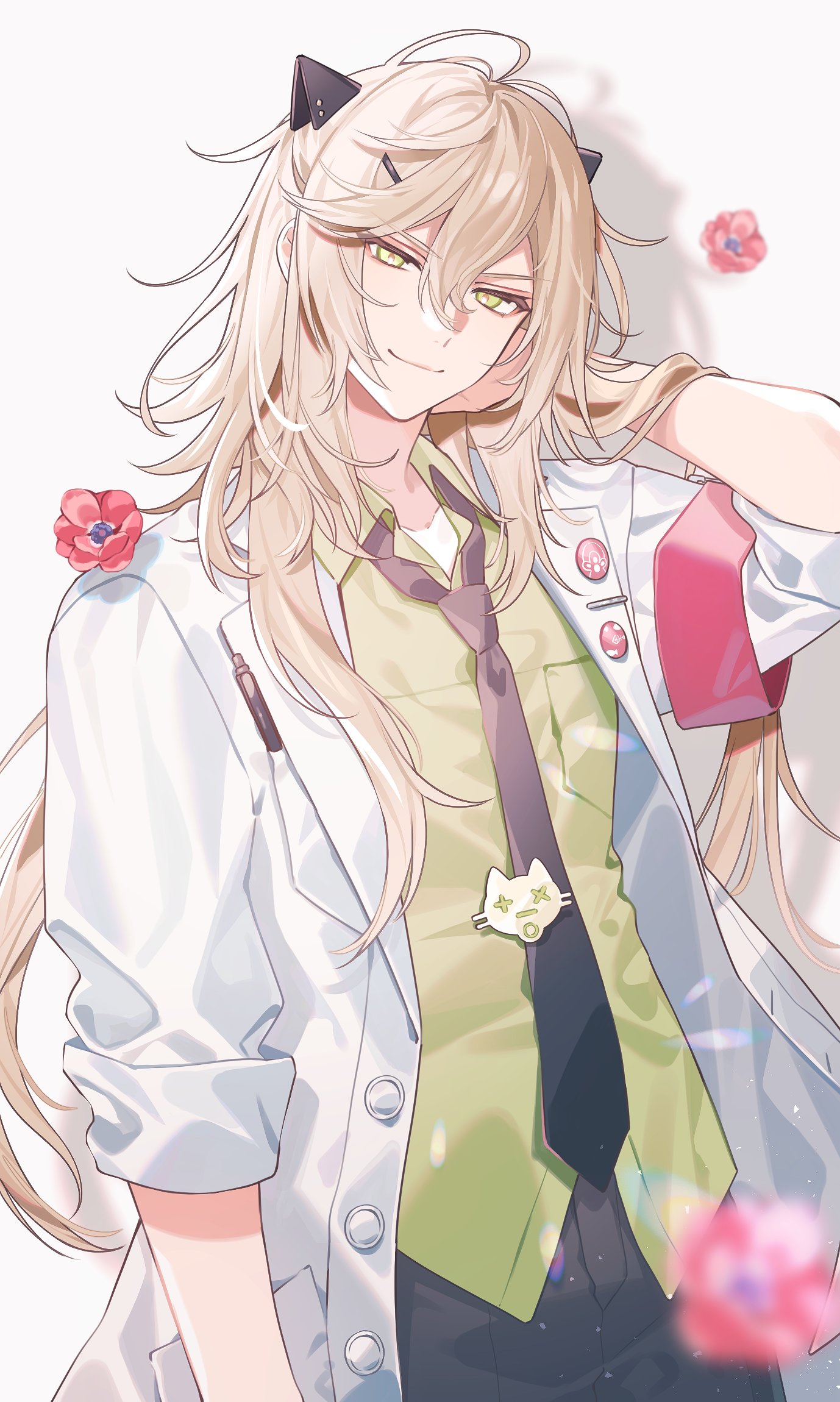 1boy arm_behind_head black_necktie black_pants blonde_hair blurry blurry_foreground buttons cat_ornament collar_x_malice collared_shirt cone_horns cowboy_shot flower green_eyes green_shirt hanamori_design head_tilt highres horns lab_coat looking_at_viewer male_focus necktie pants red_flower shiraishi_kageyuki shirt simple_background sleeves_rolled_up smile solo undershirt white_background white_shirt