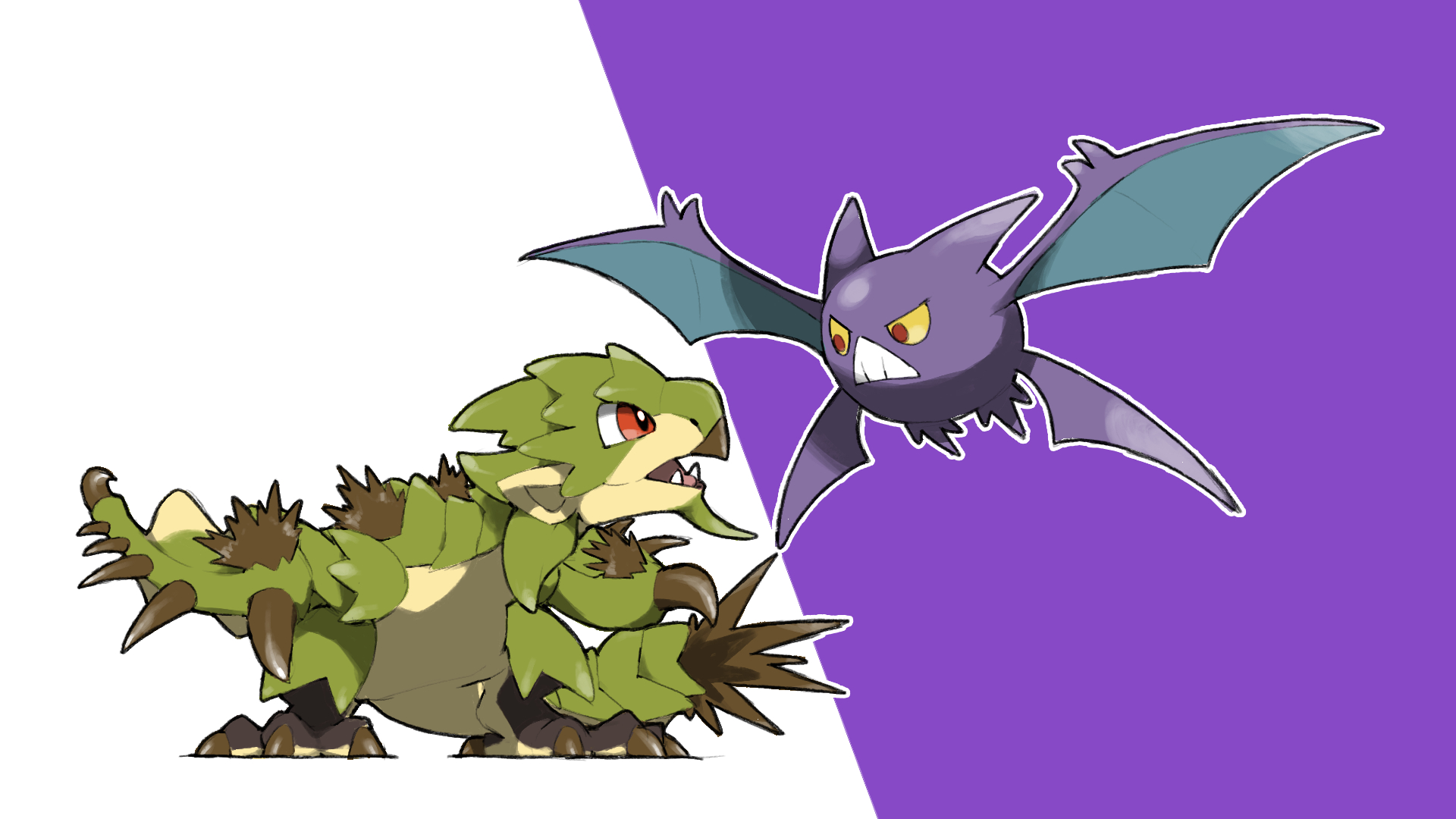animal_focus blacknirrow claws colored_sclera crobat crossover fangs flying gen_2_pokemon highres monster monster_hunter_(series) nintendo no_humans open_mouth outline pokemon pokemon_(creature) purple_background rathian red_eyes simple_background teeth two-tone_background white_background white_outline yellow_sclera