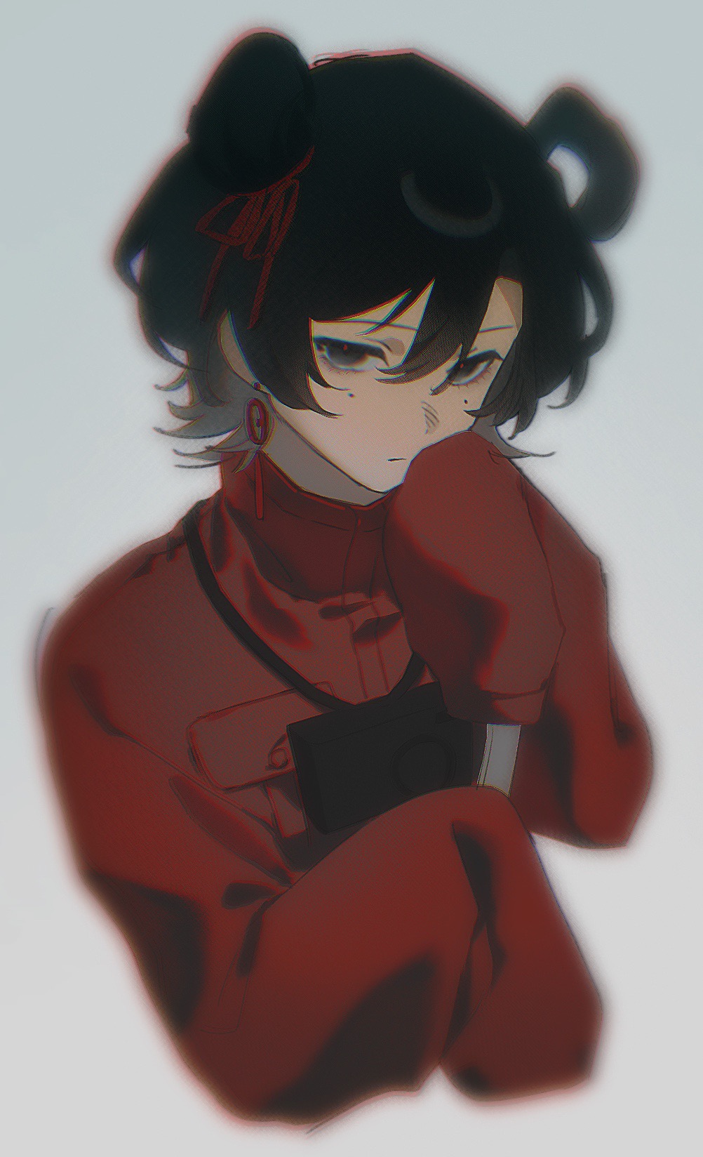 1girl black_eyes black_hair camera camera_around_neck chromatic_aberration closed_mouth commentary earrings expressionless grey_background hair_bun hair_ribbon hair_rings highres huidu jacket jewelry li_yuting_(female) long_sleeves mole mole_under_each_eye mole_under_eye multiple_moles red_jacket red_ribbon ribbon short_hair simple_background single_hair_bun single_hair_ring sleeves_past_fingers sleeves_past_wrists solo touqi_guaitan variant_set