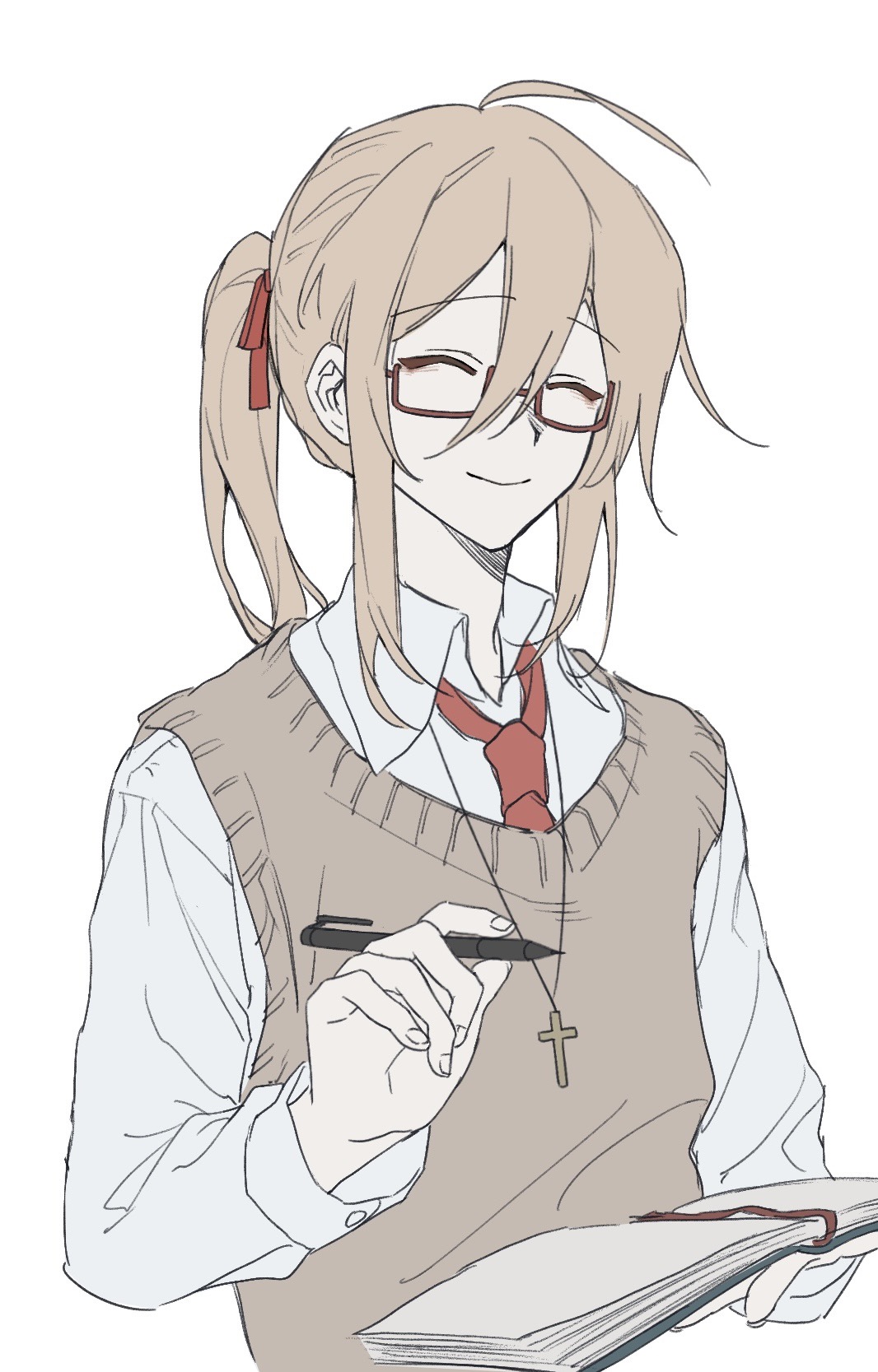 1boy ahoge blonde_hair book brown_sweater_vest chinese_commentary closed_eyes closed_mouth collared_shirt commentary_request cross cross_necklace degrees_of_lewdity glasses hair_between_eyes hair_ribbon highres holding holding_book holding_pen huidu jewelry long_sleeves male_focus medium_hair necklace necktie pen ponytail red-framed_eyewear red_necktie red_ribbon ribbon semi-rimless_eyewear shirt sidelocks simple_background smile solo sweater_vest sydney_(degrees_of_lewdity) sydney_(male)_(degrees_of_lewdity) upper_body variant_set white_background white_shirt