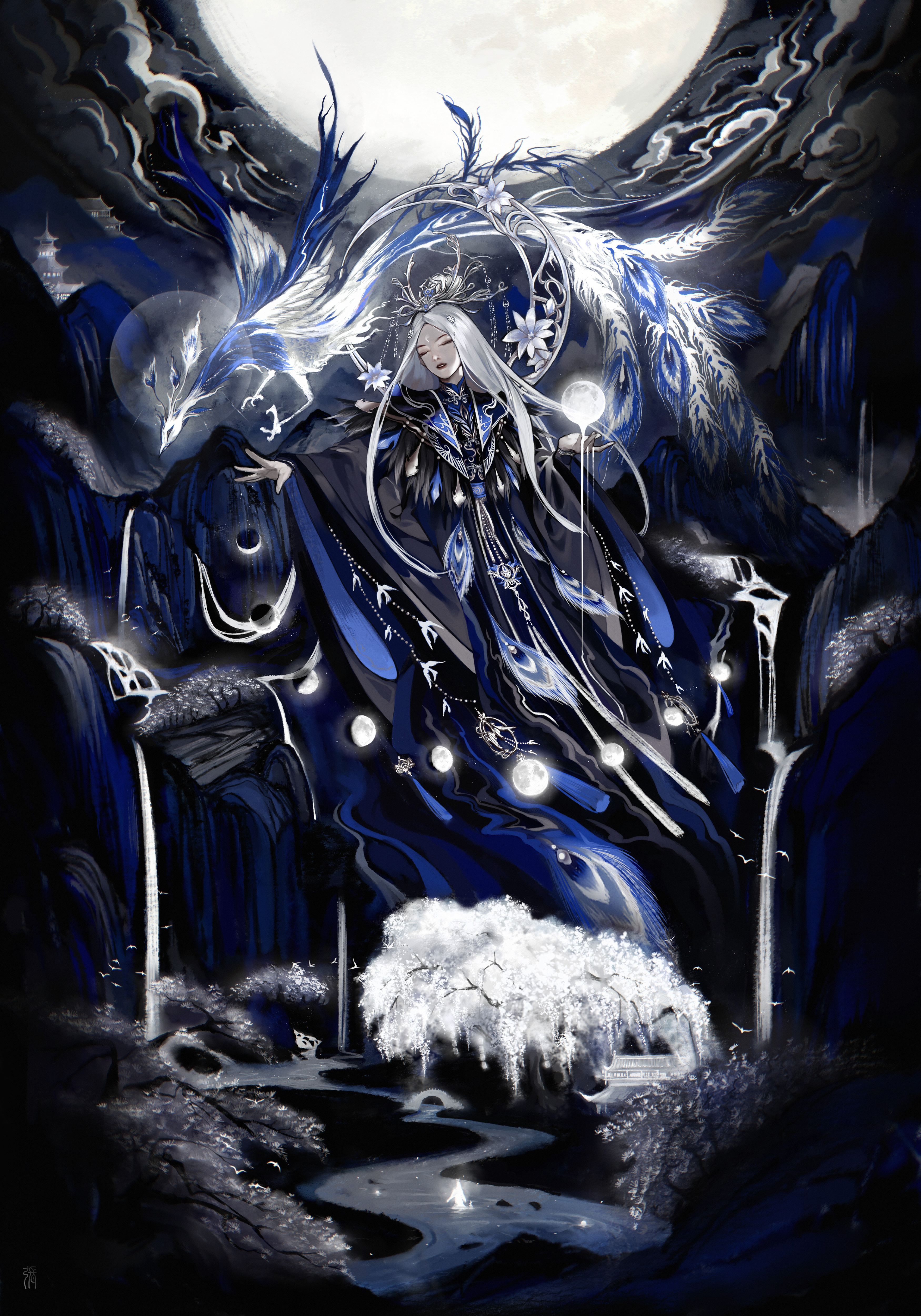 1girl absurdres black_collar black_hanfu character_request chinese_clothes closed_eyes closed_mouth collar crown dragon dripping eastern_dragon expressionless floating flower full_body full_moon hair_bun half_updo hanfu highres lipstick long_hair long_sleeves makeup moon moon_print night nikki_(series) outdoors red_lips river shining_nikki single_hair_bun solo stars_zhangzhang very_long_hair white_flower white_hair wide_sleeves yunjian