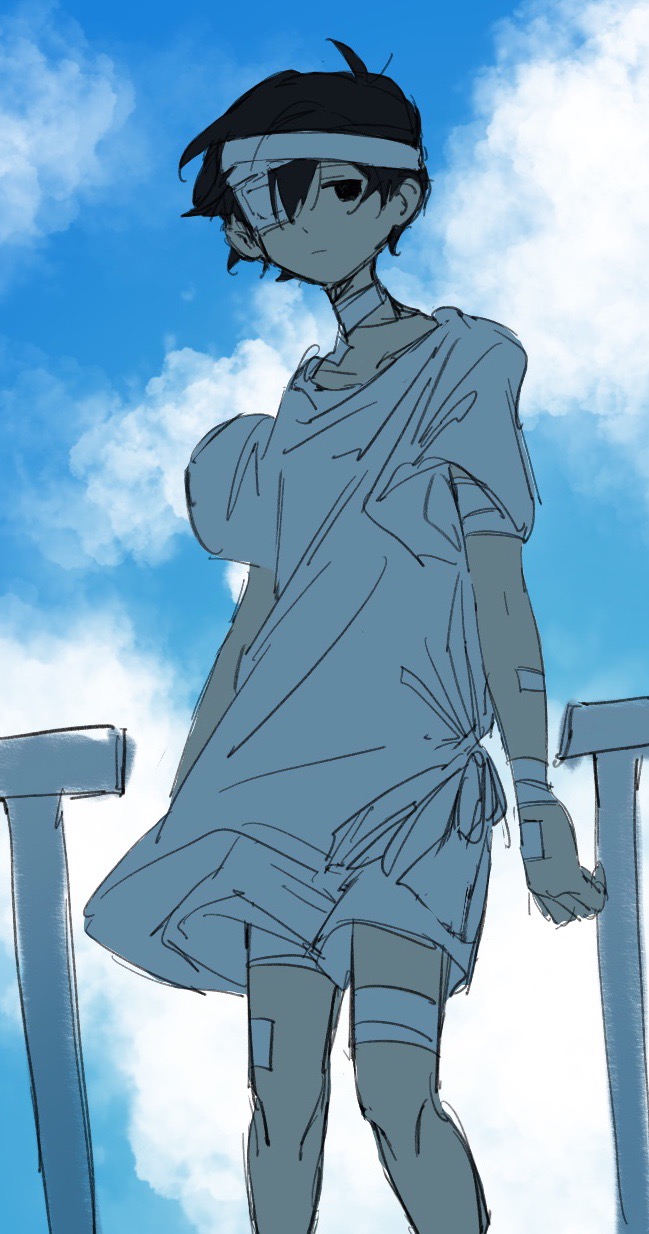 1boy bandaged_head bandaged_leg bandaged_neck bandaged_wrist bandages black_eyes black_hair blue_sky chinese_commentary closed_mouth cloud commentary_request day eyepatch feet_out_of_frame highres huidu male_focus omori outdoors railing shirt shorts sky solo sunny_(hospital_gown)_(omori) sunny_(omori) white_shirt white_shorts