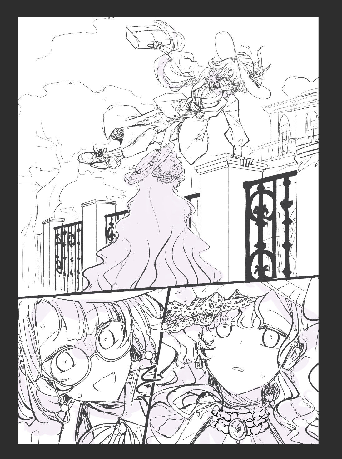 2girls brick_wall chichan54_(clubhappy) dress glasses gown highres holding holding_suitcase isolde_(reverse:1999) jewel_under_eye juliet_sleeves jumping kakania_(reverse:1999) long_hair long_sleeves multiple_girls picture_hat puffy_sleeves reverse:1999 sketch suitcase surprised sweat