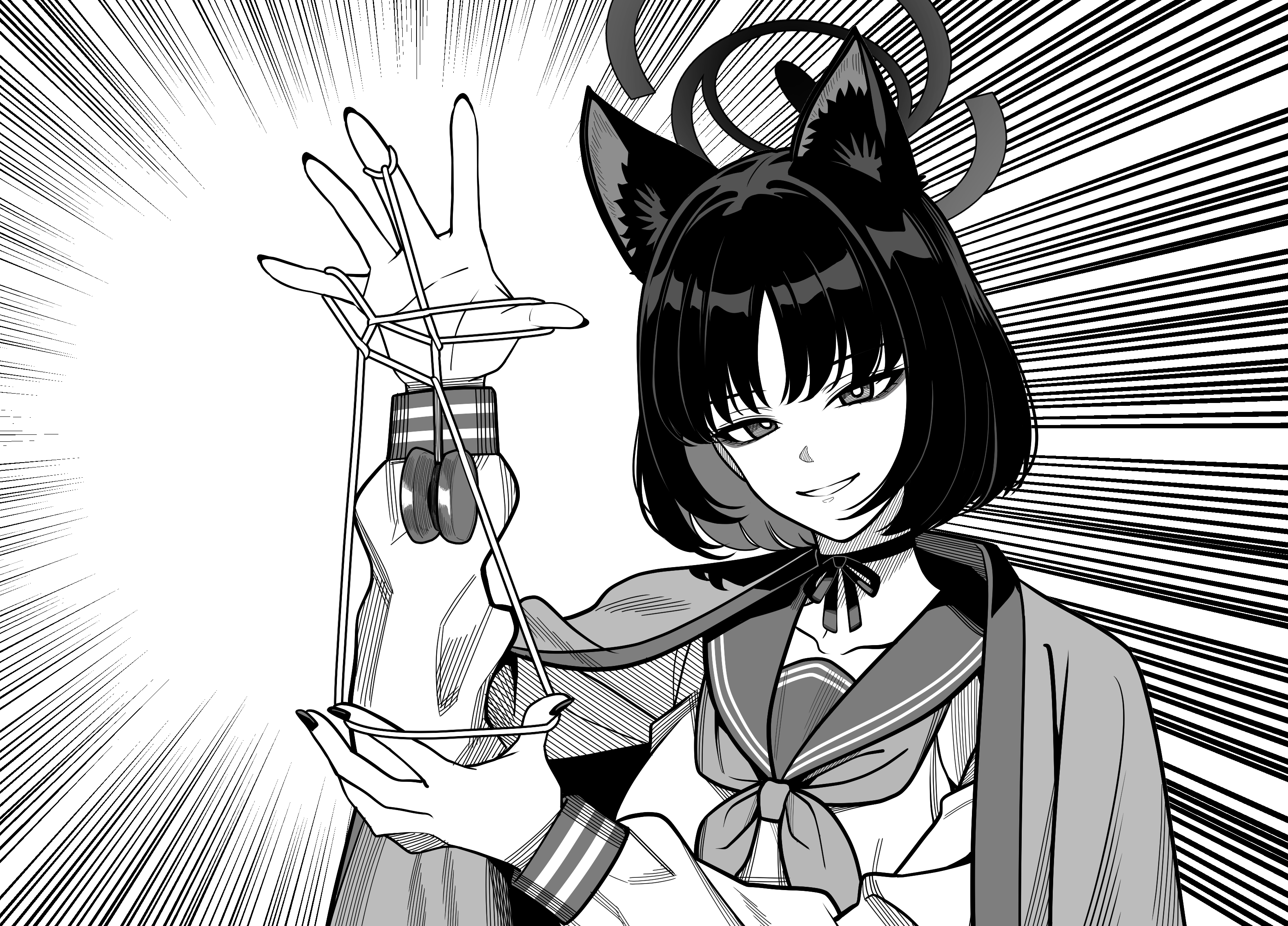 1girl animal_ears blue_archive cat_ears cat_girl choker greyscale halo haori highres japanese_clothes jshnimzz kikyou_(blue_archive) long_sleeves looking_at_viewer monochrome parted_lips sailor_collar shirt short_hair smile solo yo-yo