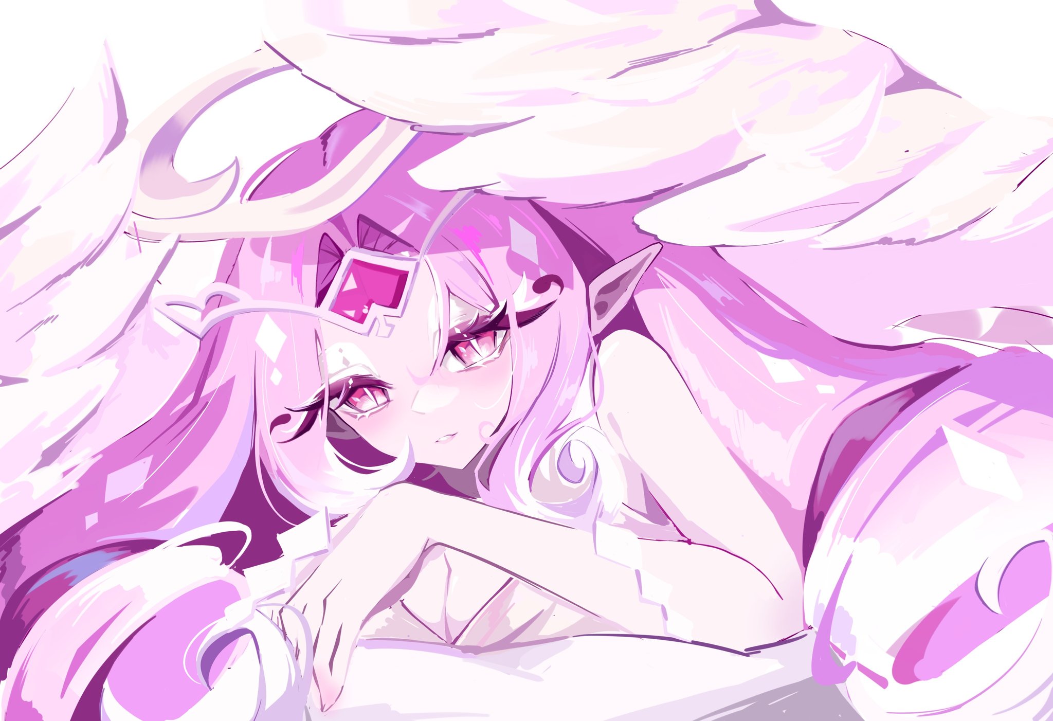 1girl angel angel_wings colored_skin commentary cookie_run cookie_run:_kingdom demon_girl dress eternal_sugar_cookie highres long_hair neungio_o pink_hair pink_skin solo wings