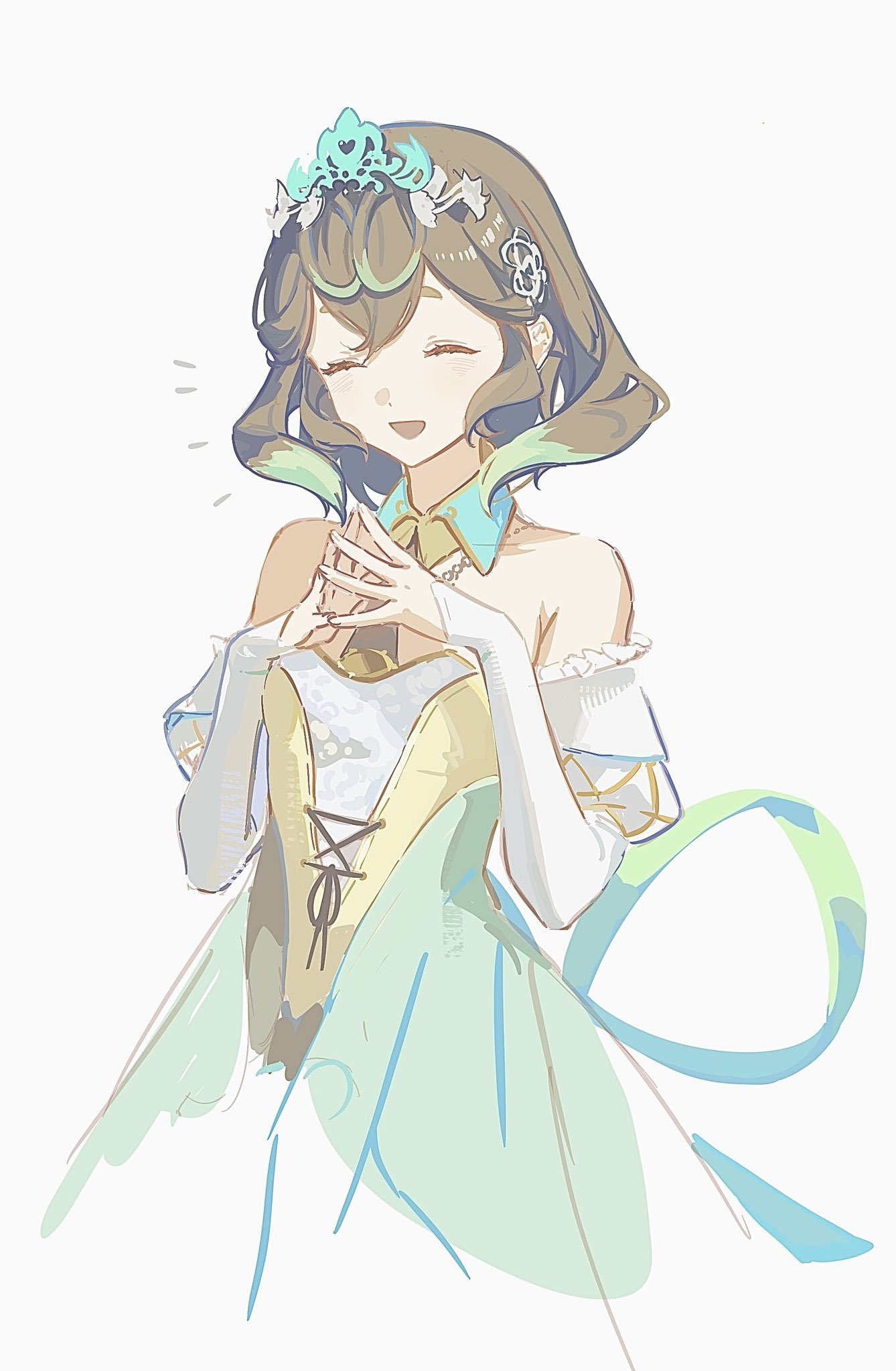 1girl ^_^ bare_shoulders brown_hair closed_eyes cowboy_shot detached_collar detached_sleeves dress final_fantasy final_fantasy_xiv highres multicolored_hair open_mouth short_hair simple_background smile solo soybean_(hisoybean) sphene_(ff14) standing steepled_fingers tiara two-tone_hair white_background white_dress