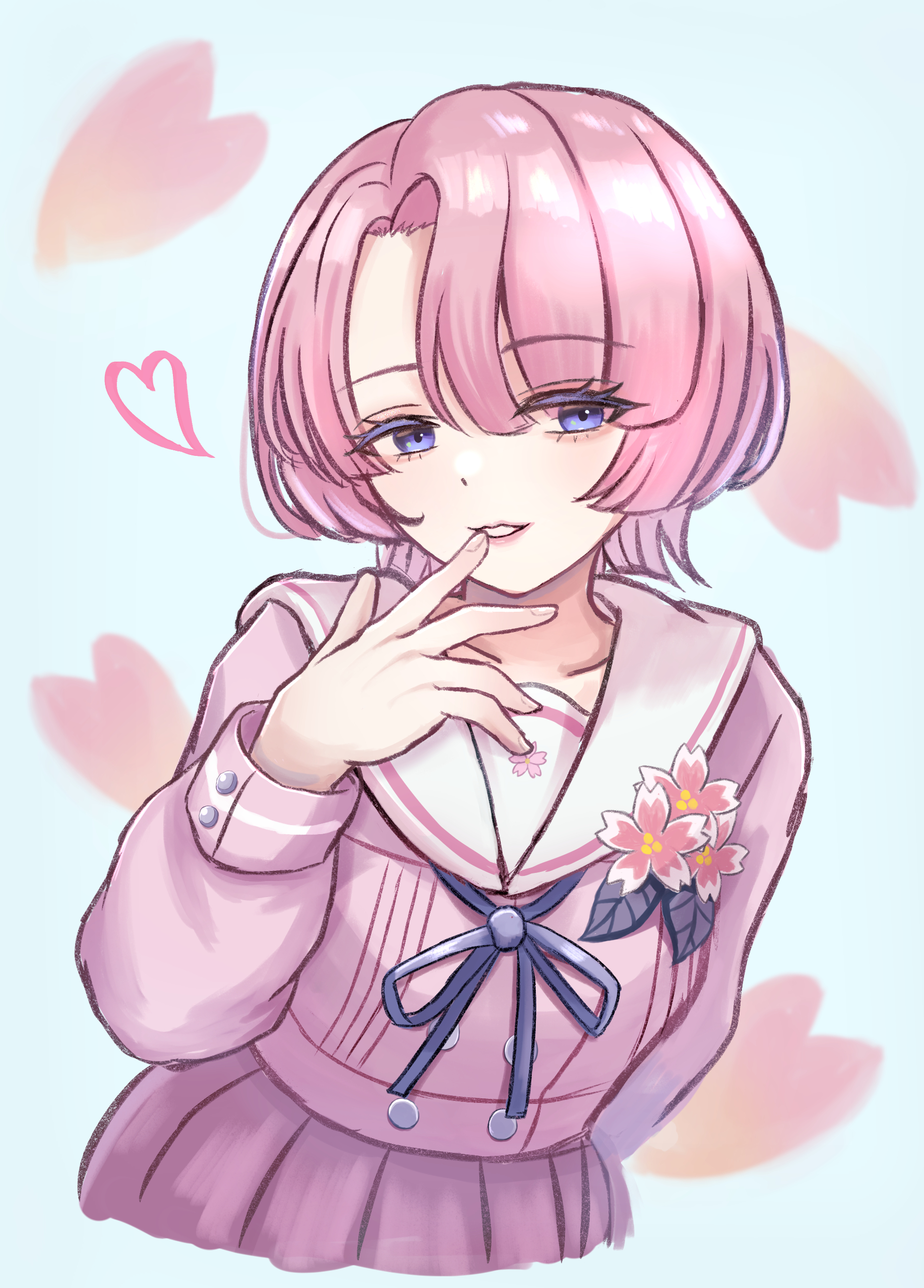 1girl absurdres arimura_mao blue_ribbon collarbone commentary_request cropped_legs gakuen_idolmaster heart highres idolmaster latte_(a_nextsystem) long_sleeves looking_at_viewer neck_ribbon pink_hair pink_serafuku pleated_skirt ribbon school_uniform serafuku short_hair skirt smile solo white_background