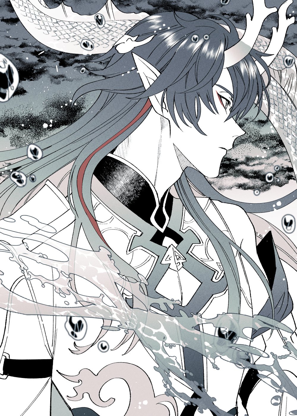 1boy arm_belt belt belt_buckle bubble buckle closed_mouth collared_shirt commentary dan_heng_(honkai:_star_rail) dan_heng_(imbibitor_lunae)_(honkai:_star_rail) dragon_horns dragon_tail floating_hair greyscale hashtag-only_commentary highres honkai:_star_rail honkai_(series) horns long_hair long_pointy_ears looking_ahead male_focus monochrome pointy_ears shirt solo spot_color tail upper_body very_long_hair wokome