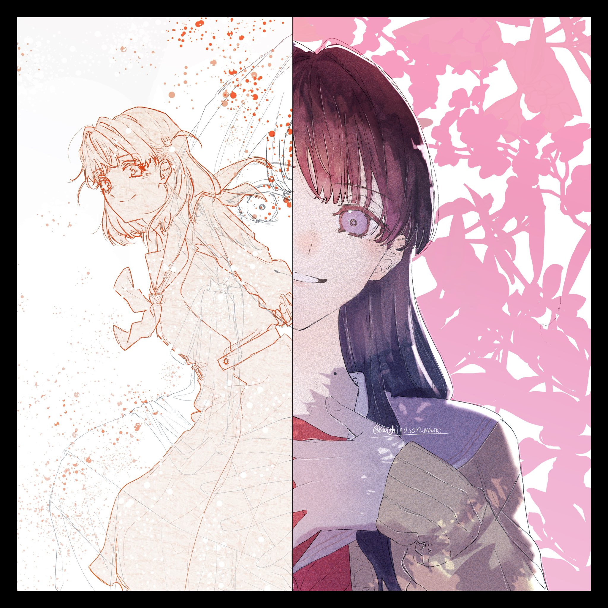 2girls aashinosoramame arms_behind_back black_border blue_eyes blue_hair blush border brown_cardigan brown_dress cardigan closed_mouth commentary_request dress grin hair_intakes hair_ornament hair_ribbon half_updo hasu_no_sora_school_uniform highres hinoshita_kaho link!_like!_love_live! long_hair long_sleeves looking_at_viewer love_live! low_twintails medium_dress medium_hair multiple_girls murano_sayaka neckerchief open_cardigan open_clothes orange_theme partially_colored pink_background pleated_dress rabbit_hair_ornament red_neckerchief ribbon sailor_collar sailor_dress school_uniform sleeves_past_wrists smile split_mouth split_theme twintails twitter_username two_side_up virtual_youtuber white_background white_sailor_collar winter_uniform