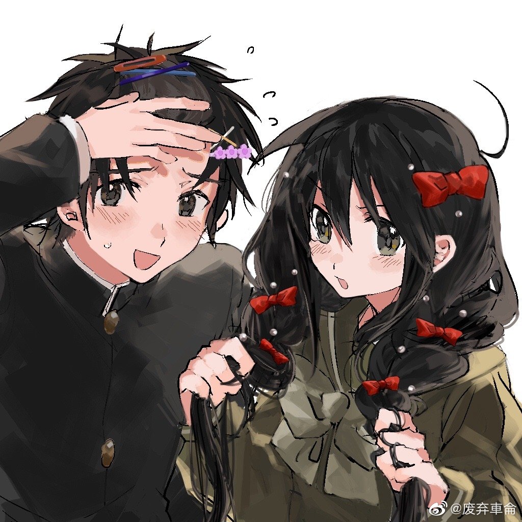 1boy 1girl black_eyes black_hair blush couple feiqi_chelun flying_sweatdrops gakuran green_serafuku hair_ornament hairpin long_hair low-tied_long_hair red_ribbon ribbon sakai_yuuji school_uniform serafuku shakugan_no_shana shana watermark weibo_username weibo_watermark