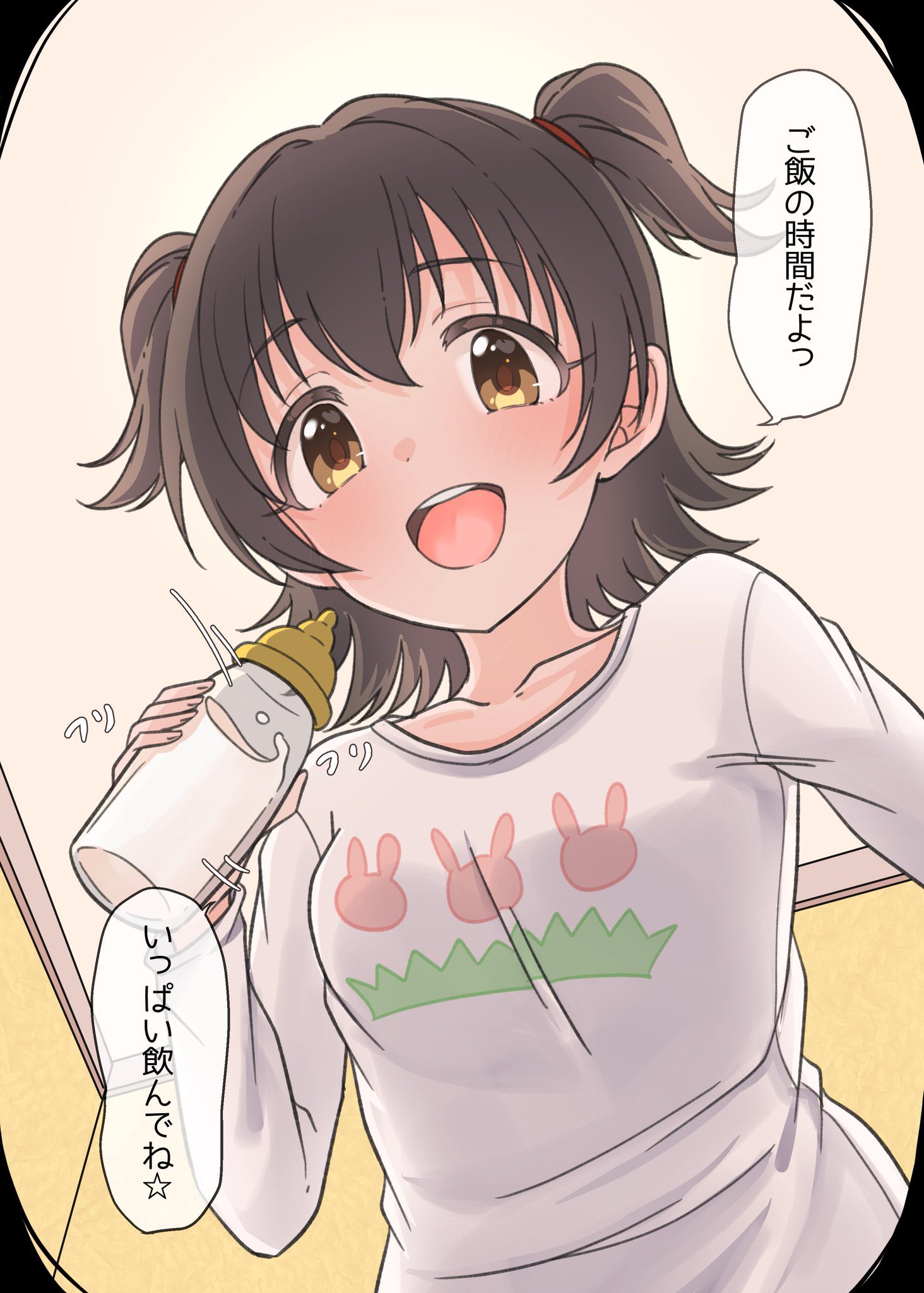 1girl akagi_miria blush bottle breasts brown_eyes brown_hair ceiling collarbone commentary from_below highres holding holding_bottle idolmaster idolmaster_cinderella_girls indoors long_sleeves looking_at_viewer mariabowl milk milk_bottle open_mouth shirt short_hair smile solo speech_bubble teeth tongue translation_request two_side_up upper_body upper_teeth_only white_shirt