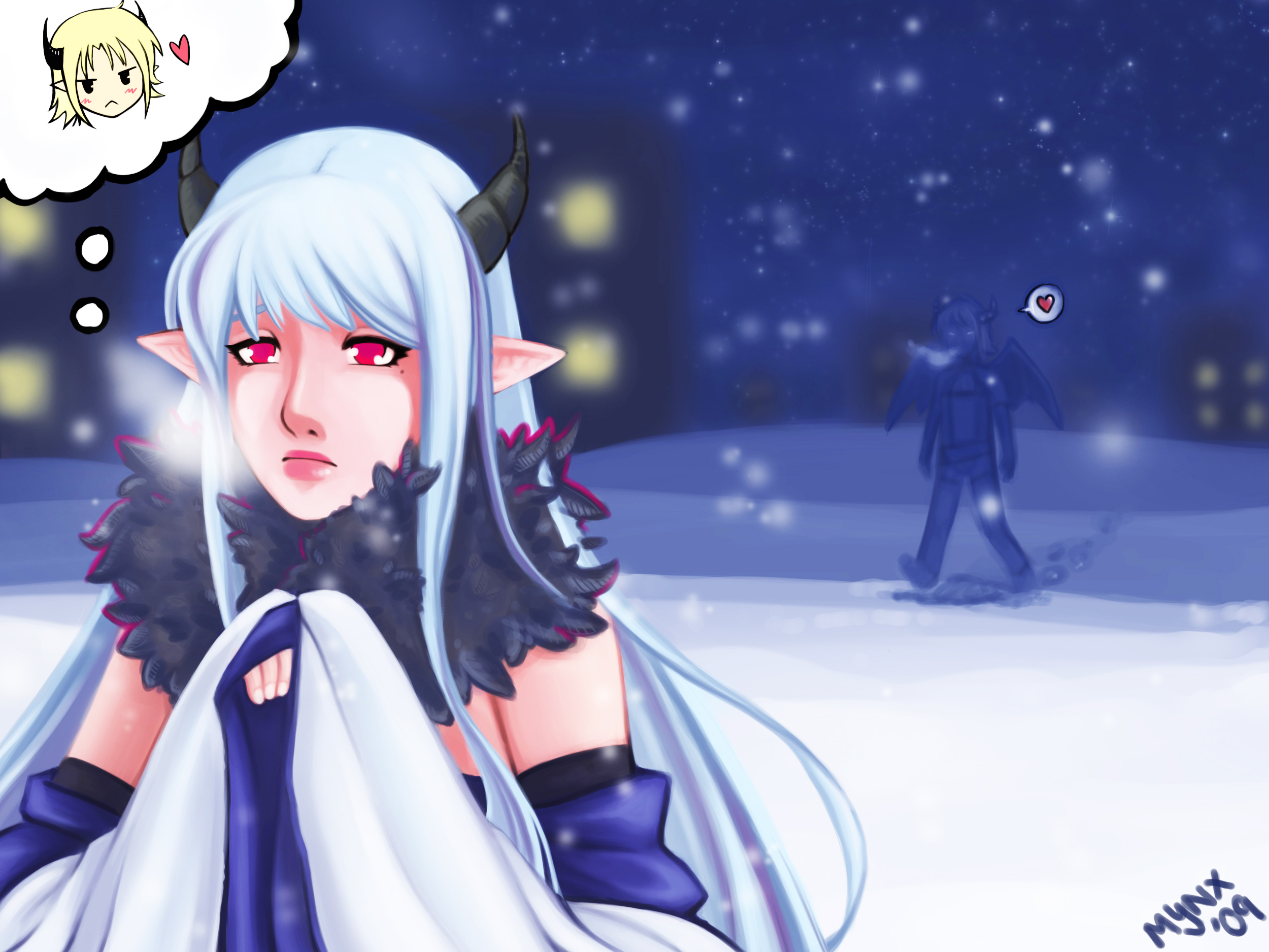 1boy 1girl 2009 alternate_color animal animal_around_neck black_horns blue_sky blurry blurry_background breath closed_mouth commentary demon_boy detached_sleeves english_commentary expressionless fox highres horns incubus_(ragnarok_online) lips long_hair mole mole_under_eye mynxuu night outdoors pointy_ears professor_(ragnarok_online) ragnarok_online red_eyes signature sky snow snowing solo_focus upper_body walking white_hair white_sleeves