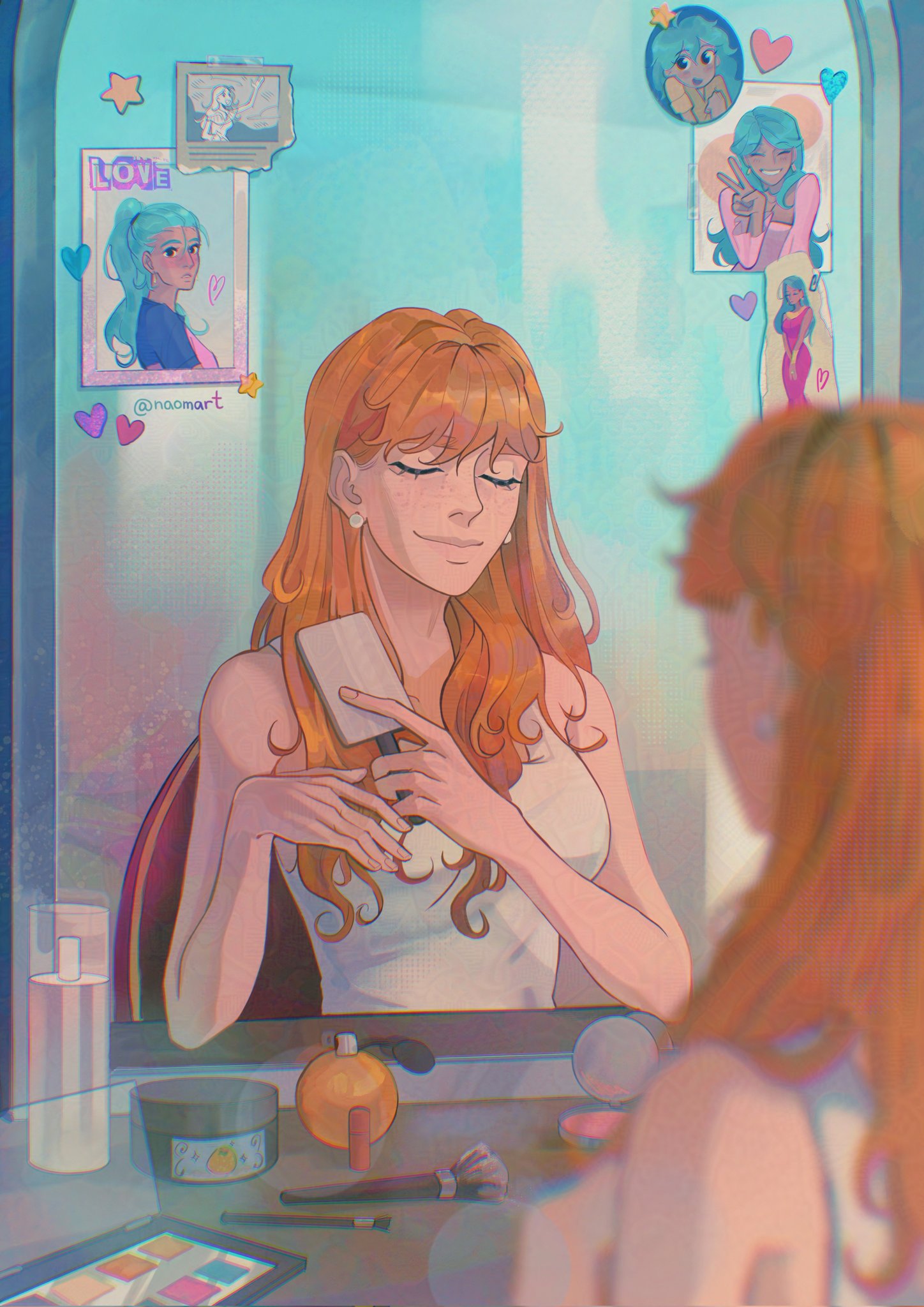 1girl blue_hair blue_shirt bottle brushing_hair closed_eyes earrings freckles hair_brush heart heart_sticker highres holding holding_hair_brush jewelry makeup makeup_brush nami_(one_piece) naomart nefertari_vivi one_piece orange_hair pearl_earrings perfume_bottle photo_(object) shirt sitting star_(symbol) star_sticker sticker tank_top white_tank_top