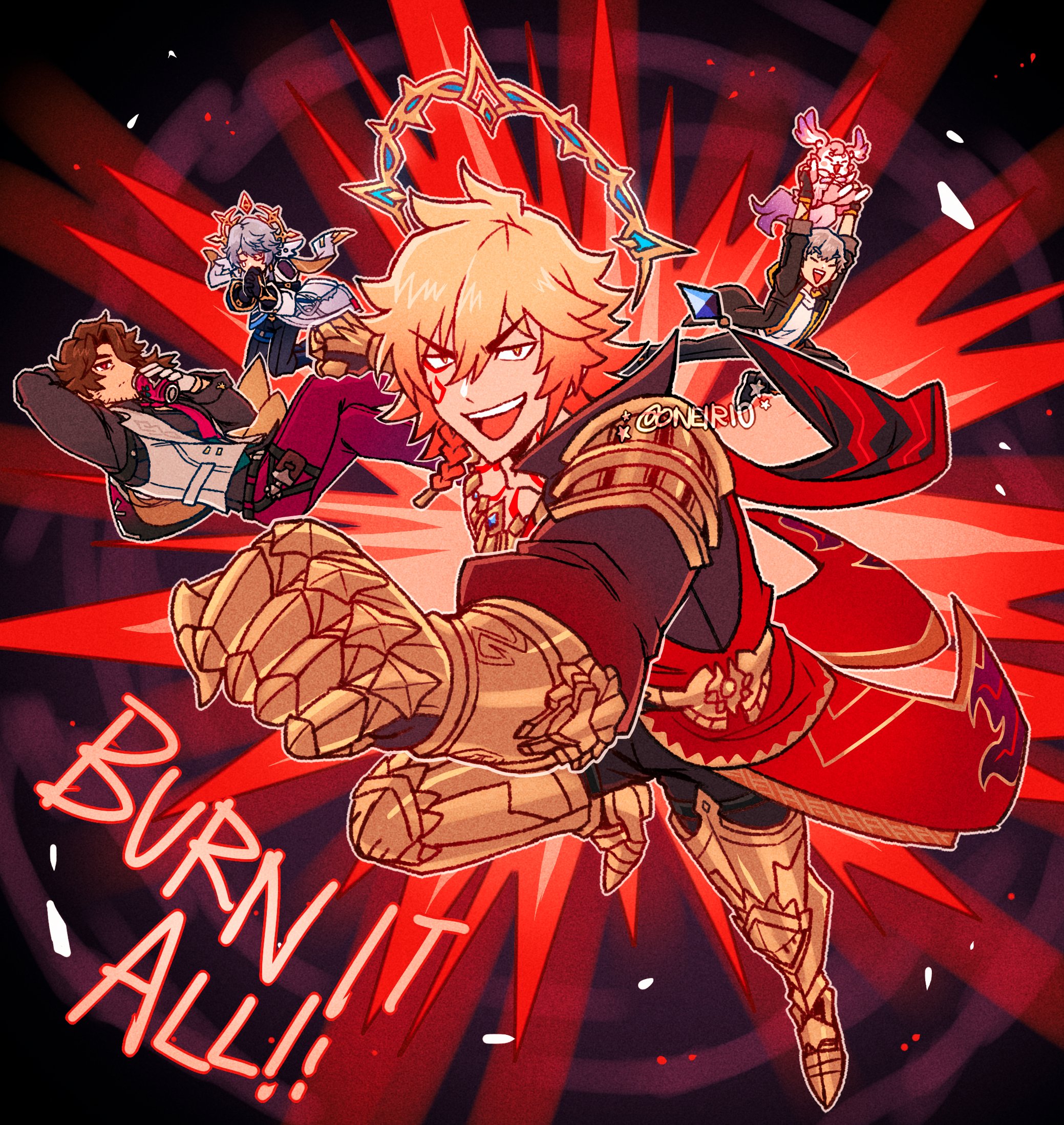 1other 4boys animal armor armored_boots arms_up black_background black_jacket black_shirt blonde_hair boots braid brown_hair caelus_(honkai:_star_rail) can chest_tattoo commentary drink_can drinking english_commentary english_text facial_tattoo full_moon gallagher_(honkai:_star_rail) gameplay_mechanics gauntlets gold_armor gold_necklace grey_hair hair_between_eyes halo halo_behind_head highres holding holding_animal holding_can honkai:_star_rail honkai_(series) incoming_attack jacket jewelry looking_at_viewer male_focus medium_hair mem_(honkai:_star_rail) moon multiple_boys mydei_(honkai:_star_rail) necklace oneirio open_mouth own_hands_together pants red_pants red_tattoo shirt short_hair side_braid spiked_halo sunday_(honkai:_star_rail) tattoo teeth trailblazer_(honkai:_star_rail) twitter_username upper_teeth_only vest white_shirt white_vest