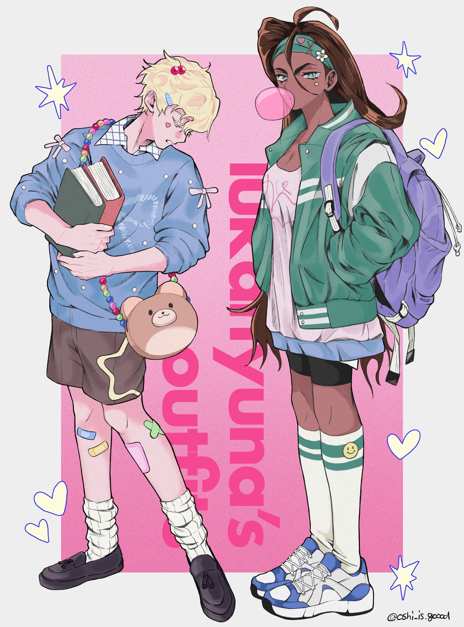1boy 1girl alien_stage alternate_costume animal_bag backpack bag bandaid bandaid_on_face bandaid_on_leg bandaid_on_nose bear_bag bike_shorts black_shoes black_shorts blonde_hair blowing_bubble_gum blowing_bubbles blue_shirt blue_skirt book brown_hair character_name chewing_gum closed_mouth collared_shirt colored_eyelashes commentary_request english_text frown green_hairband green_jacket grey_eyes hair_between_eyes hair_bobbles hair_ornament hairband hands_in_pockets heart heart_hair_ornament highres holding holding_book hyuna_(alien_stage) jacket kneehighs luka_(alien_stage) oshi_is_goood purple_bag pairing_name shirt shirt_under_sweater shoes shorts shoulder_bag skirt sneakers socks sticker sticker_on_face white_shirt white_socks yellow_eyes