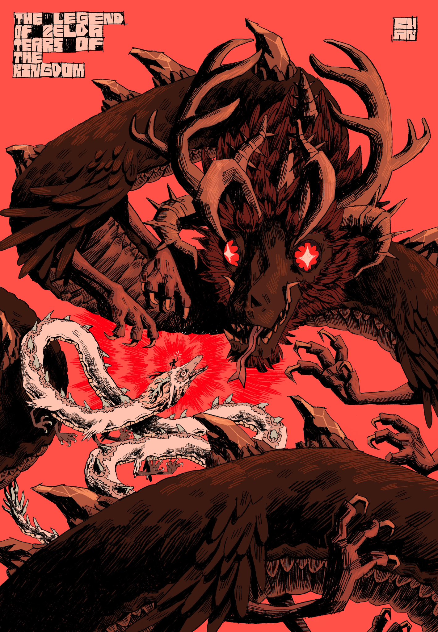 1boy artist_logo artist_name chan_(flesh.png) claws demon_dragon_(zelda) dragon dragon_horns glowing glowing_eyes highres holding holding_sword holding_weapon horns light_dragon_(zelda) logo nintendo on_head red_background shield silhouette standing sword the_legend_of_zelda the_legend_of_zelda:_tears_of_the_kingdom weapon