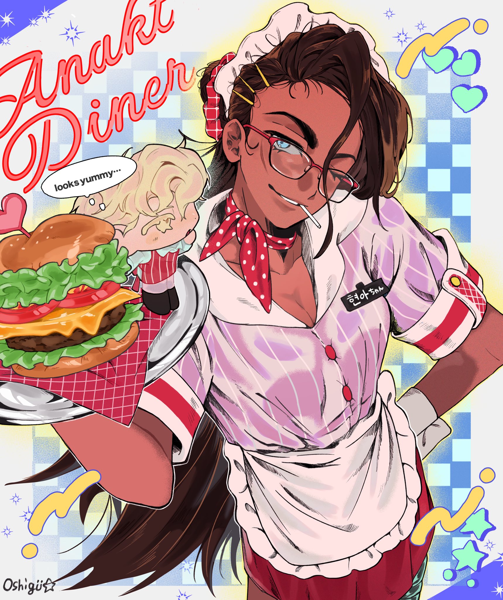 1boy 1girl alien_stage alternate_costume apron bandana bandana_around_neck blonde_hair brown_hair burger colored_eyelashes commentary dark-skinned_female dark_skin english_commentary english_text food frilled_apron frills from_above glasses grey_eyes hair_ornament hairclip hand_on_own_hip headdress heart highres holding holding_tray hyuna_(alien_stage) korean_text lettuce long_hair luka_(alien_stage) mini_person miniboy mixed-language_text name_tag oshi_is_goood pink_shirt polka_dot_bandana red-framed_eyewear red_bandana red_skirt shirt short_sleeves signature skirt speech_bubble star_(symbol) striped_clothes striped_shirt thought_bubble tomato tomato_slice translated tray vertical-striped_clothes vertical-striped_shirt very_long_hair waitress white_apron yellow_eyes