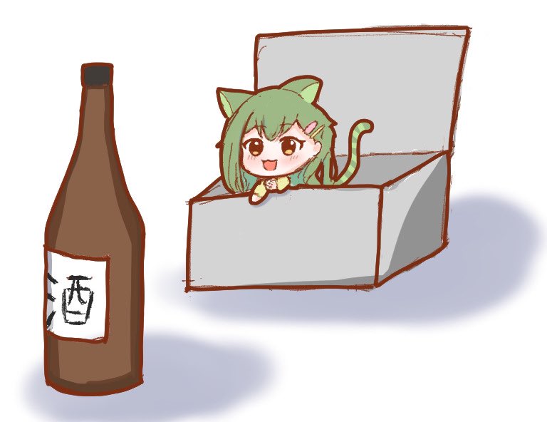 1girl :3 :d animal_ears animal_hands bottle box cat_ears cat_girl cat_tail commentary_request green_hair hair_ornament hairclip hand_on_own_hip in_box in_container kemonomimi_mode link!_like!_love_live! long_hair love_live! ogami_sachi open_mouth orange_eyes sake_bottle schrodinger's_cat simple_background smile solo straight_hair swept_bangs tail tokusa_(sachi_biglove) white_background