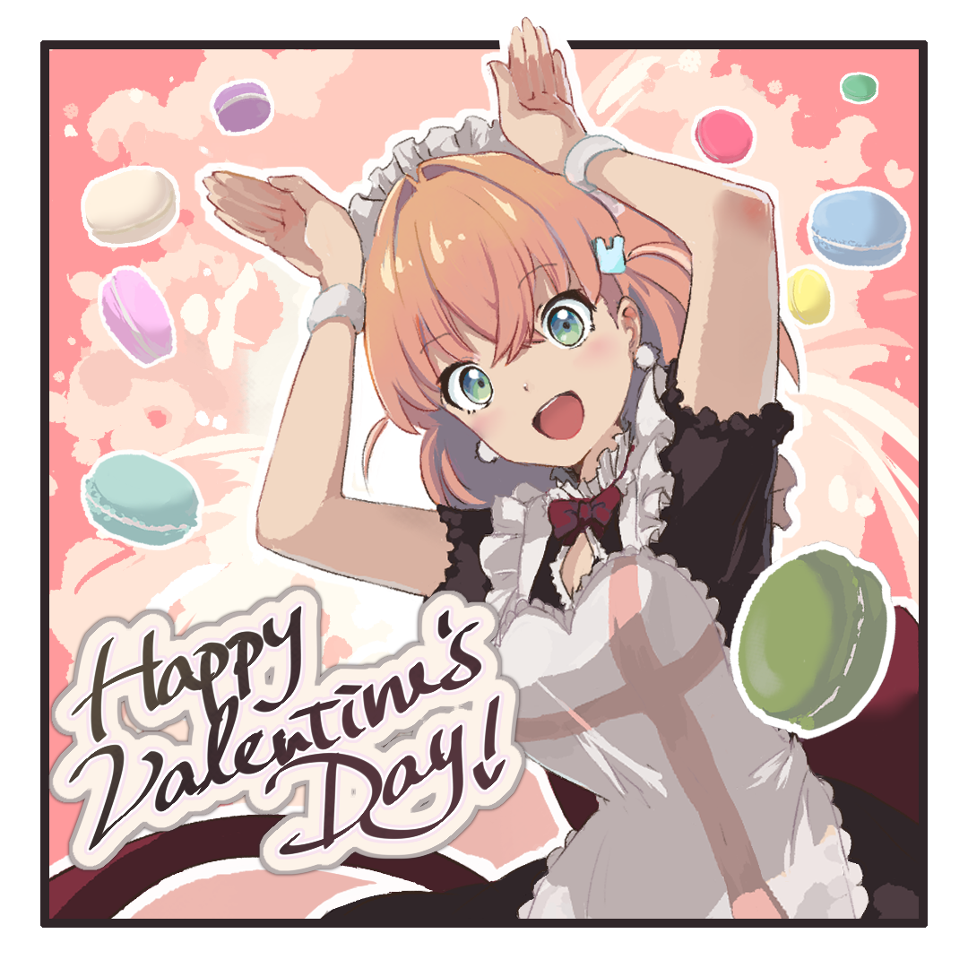 1girl apron aqua_eyes arm_up black_dress border breasts cleavage_cutout clothing_cutout commentary commentary_request cosplay crossed_bangs dress english_commentary food frilled_apron frilled_dress frills hair_ornament happy_valentine heart_apron hinoshita_kaho kosaka_honoka kosaka_honoka_(cosplay) large_breasts link!_like!_love_live! love_live! love_live!_school_idol_project macaron maid_apron medium_hair mixed-language_commentary mogyutto_"love"_de_sekkin_chuu! orange_hair outline outside_border pink_background rabbit_hair_ornament rabbit_pose short_sleeves solo two_side_up virtual_youtuber white_apron white_border white_outline yulittlove