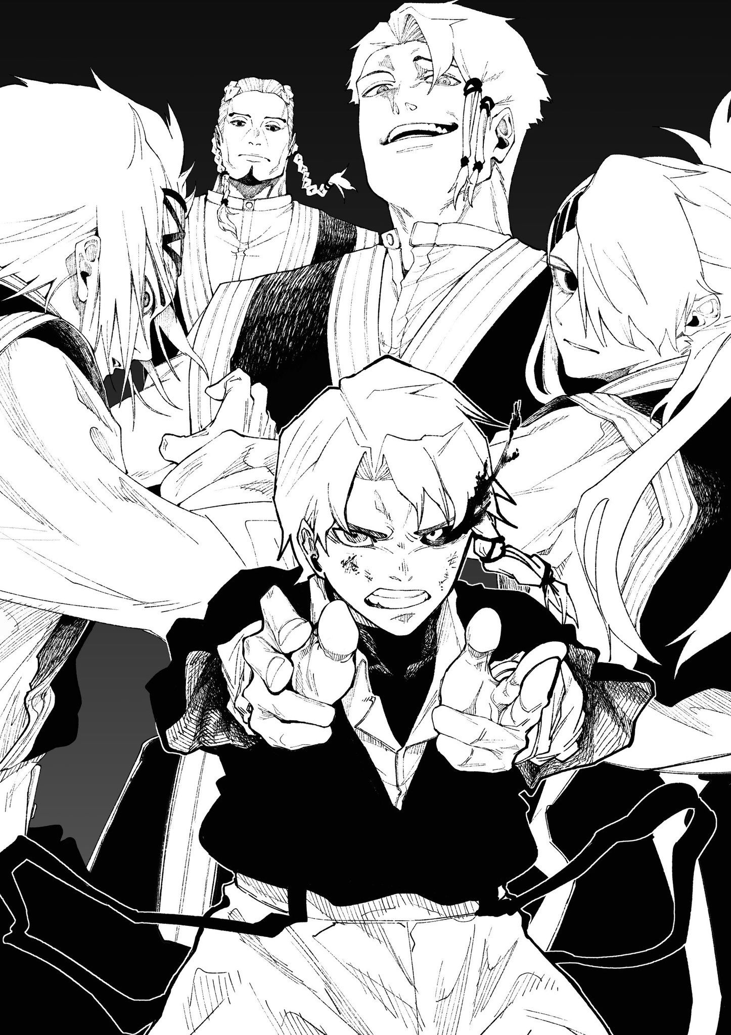 1girl 4boys beard braid clenched_teeth cowboy_shot facial_hair greyscale hair_over_one_eye hands_up highres jacket kagurabachi long_hair long_sleeves monochrome multiple_boys open_mouth pants profile sazanami_enji sazanami_hakuri sazanami_souya sazanami_tamaki sazanami_tenri shirt short_hair siblings side_braid simple_background smile standing teeth twin_braids upper_body yamagata_(user_ymrx4758)