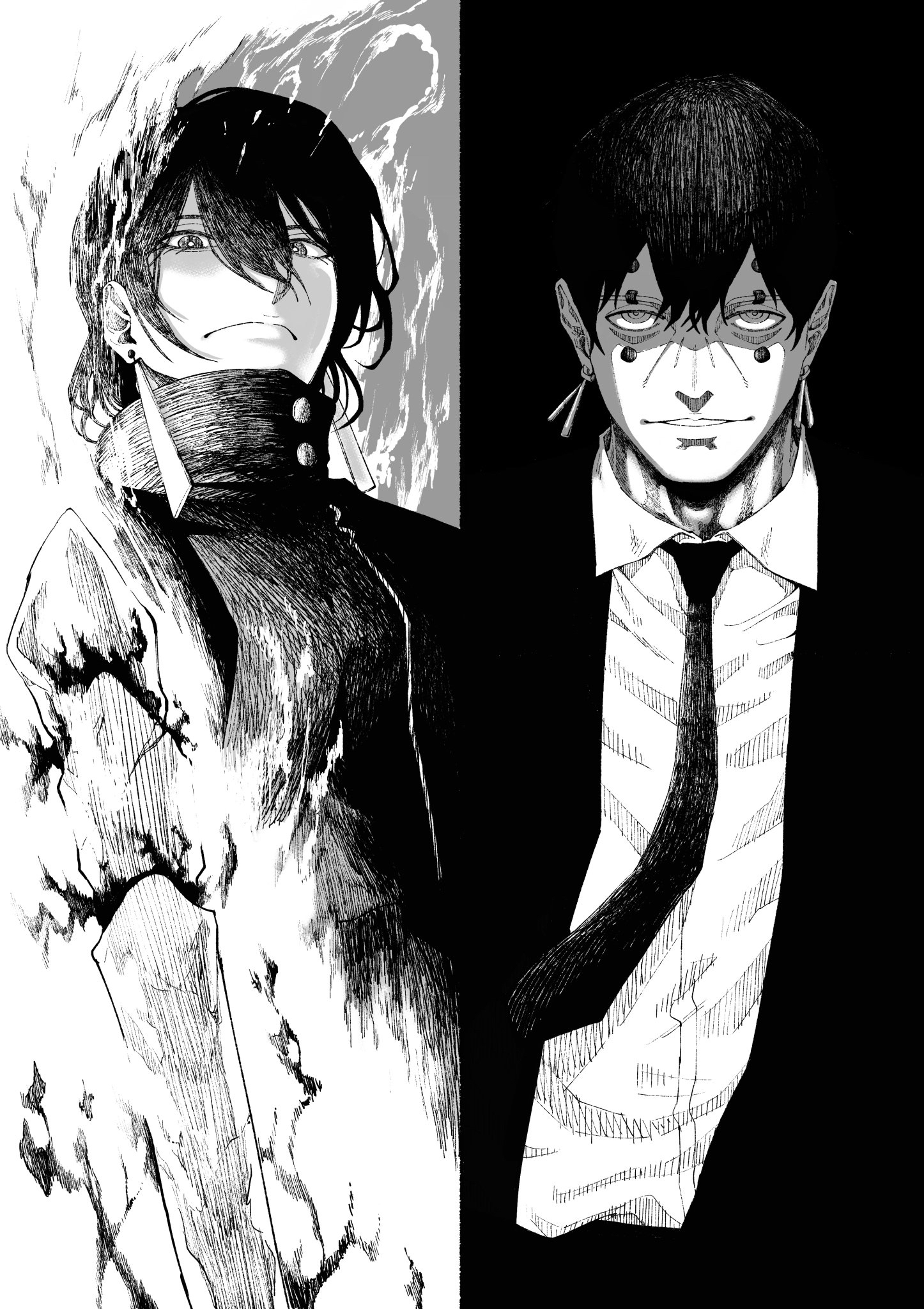 1boy 1girl closed_mouth collared_shirt earrings facial_tattoo fire greyscale high_collar highres jacket jewelry kagari_hiyuki kagurabachi monochrome necktie parted_lips shirt short_hair smile suit_jacket tattoo yamagata_(user_ymrx4758) yura_(kagurabachi)