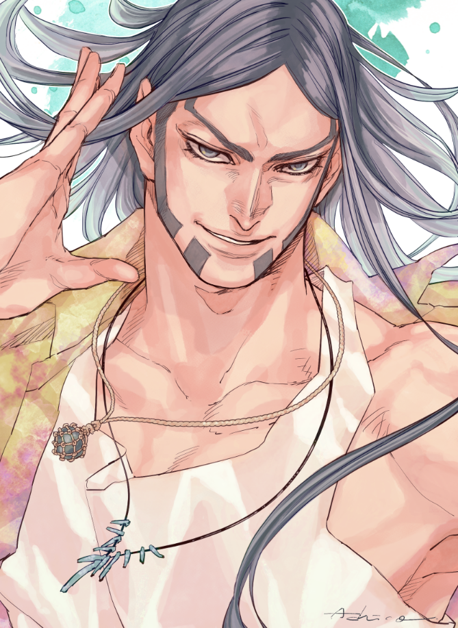 1boy achio888 beard black_hair collarbone eyelashes facial_hair golden_kamuy grey_eyes jewelry long_hair long_sideburns looking_at_viewer male_focus mature_male multiple_necklaces necklace oosawa_fusatarou parted_lips shirt sideburns signature solo upper_body white_shirt