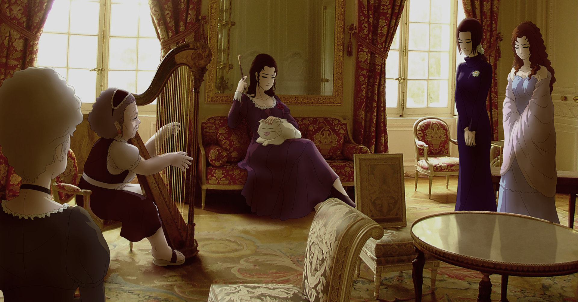 5girls bara_to_tsubaki black_choker blue_dress breasts brown_hair cat chair choker cleavage commentary_request couch crossed_legs curtains dress frown grey_hair harp highres holding holding_smoking_pipe instrument long_dress long_hair maid maid_headdress medium_breasts mirror mita_etsuko multiple_girls music naramura old old_woman photo_background playing_instrument ponytail puffy_short_sleeves puffy_sleeves purple_dress sandals short_hair short_sleeves siblings sisters smile smoking_pipe strapless strapless_dress table tsubakikoji_hanae tsubakikoji_reiko tsubakikoji_saori tsubakikoji_shizuka turtleneck turtleneck_dress wavy_hair window