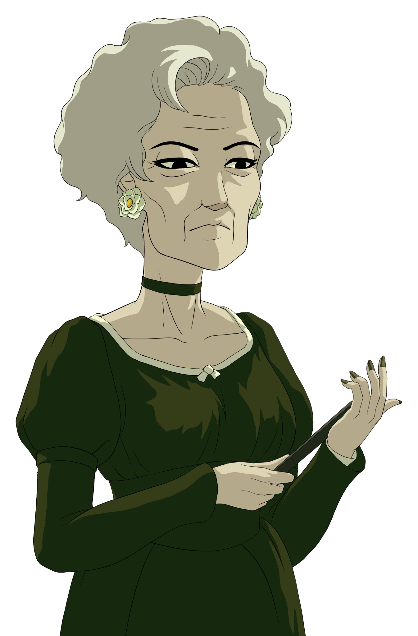 1girl bara_to_tsubaki black_eyes breasts cheekbones dress earrings flower_earrings folding_fan frown green_dress hand_fan high-waist_dress highres holding holding_fan jewelry medium_breasts naramura official_art old old_woman short_hair solo tsubakikoji_hanae upper_body white_hair