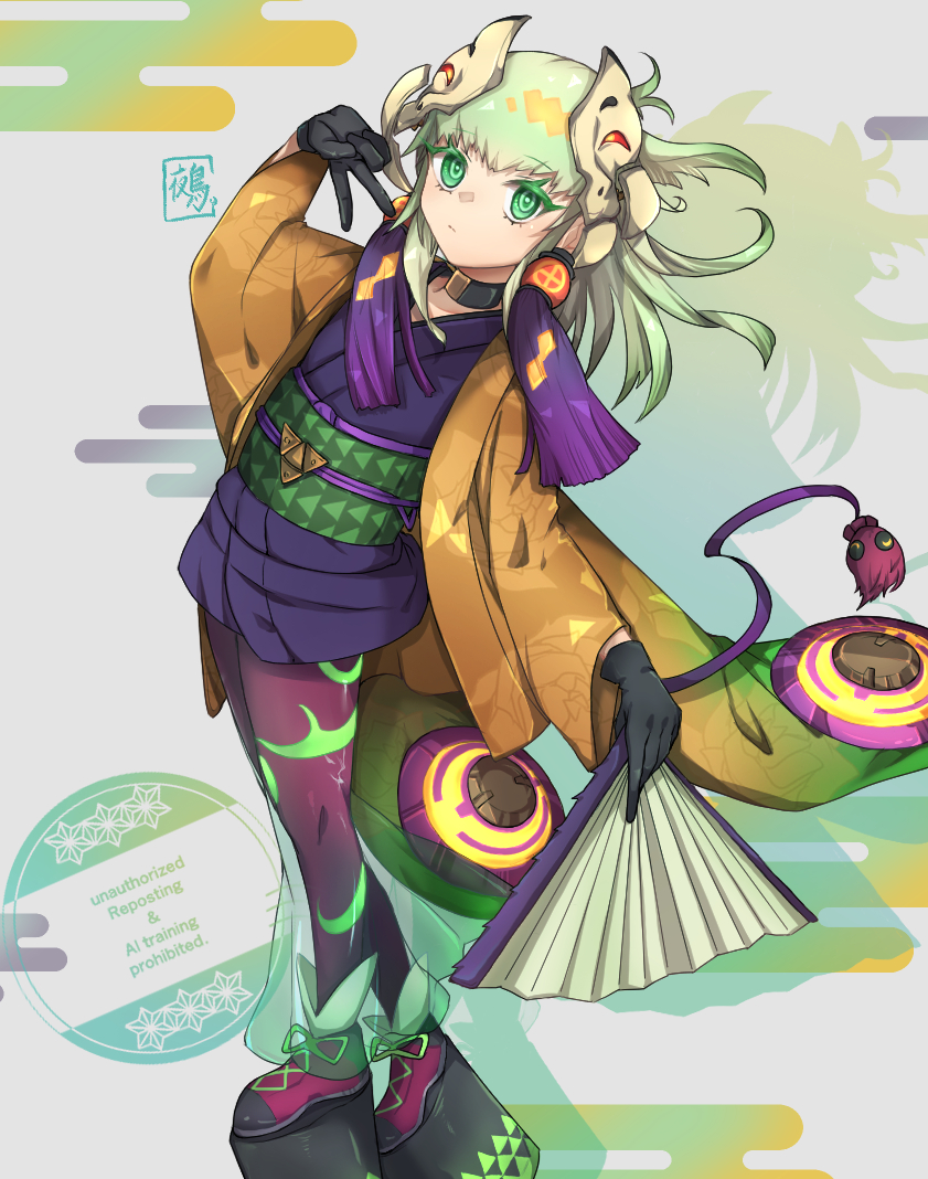 1girl black_kimono duel_monster full_body green_eyes green_hair hand_fan holding holding_fan japanese_clothes kimono medium_hair noh-p.u.n.k._ze_amin pantyhose purple_pantyhose solo watermark yoruno_tori3 yu-gi-oh!