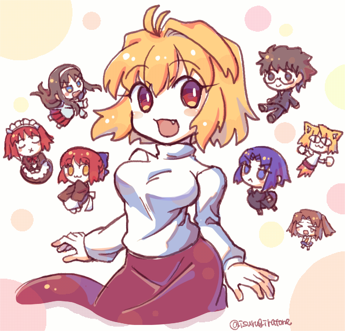 1boy 6+girls :3 :d angry animal_ears arcueid_brunestud black_eyes black_hair blonde_hair blue_eyes blue_hair blush blush_stickers bow breasts brown_hair cat_ears cat_girl chibi ciel_(tsukihime) closed_eyes closed_mouth crying dual_persona fang formal_clothes glasses hair_bow hisui_(tsukihime) isurugiratone japanese_clothes kimono kohaku_(tsukihime) large_breasts long_hair looking_at_viewer maid maid_headdress melty_blood multiple_girls neco-arc nun open_mouth purple_skirt red_eyes red_hair school_uniform short_hair siblings simple_background skirt smile smug sweater tohno_akiha tohno_shiki tsukihime tunic turtleneck turtleneck_sweater twins twintails yellow_eyes yumizuka_satsuki