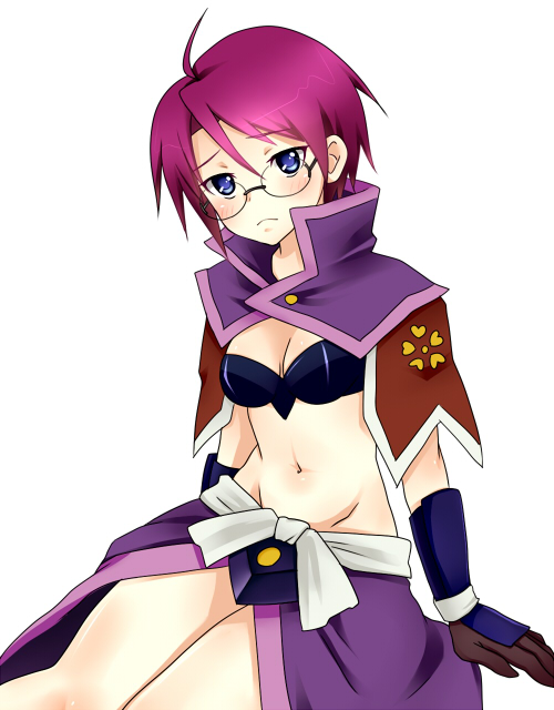 10s ahoge akechi_mitsuhide_(sengoku_otome) armor blue_eyes blush breasts capelet cleavage frown glasses midriff purple_hair sengoku_otome short_hair sitting
