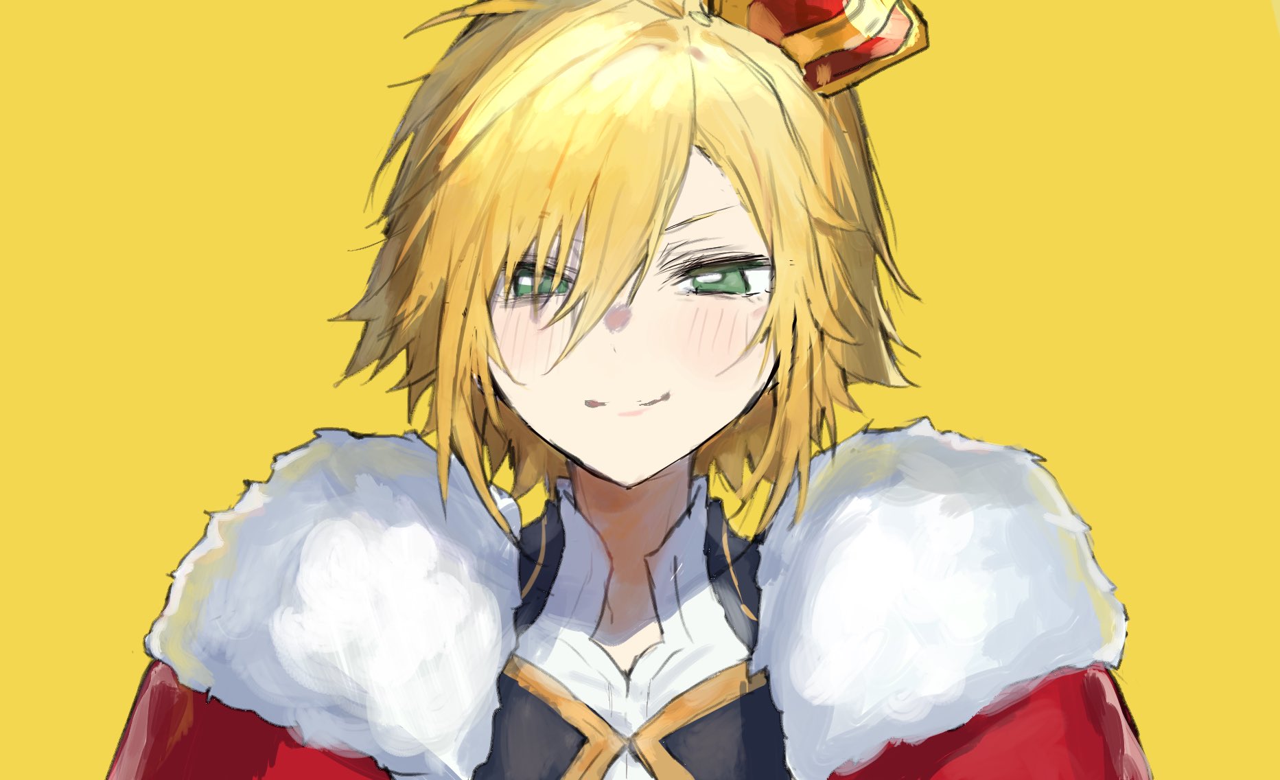 1boy blonde_hair blush cape closed_mouth commentary_request crown fur-trimmed_cape fur_trim green_eyes highres inusaka looking_to_the_side male_focus mini_crown nijisanji parted_bangs red_cape simple_background smile solo straight-on upper_body uzuki_kou virtual_youtuber white_fur yellow_background