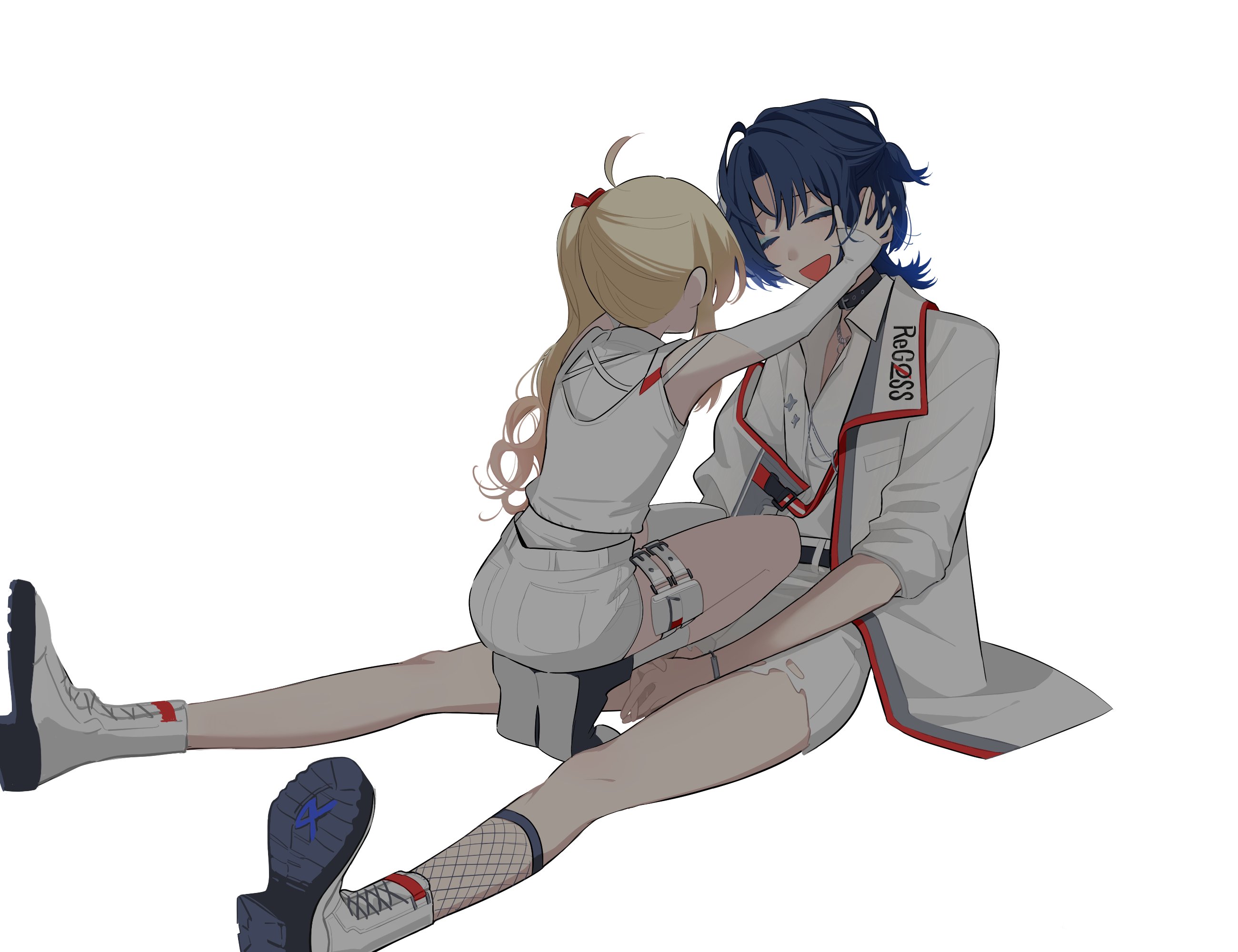 2girls ahoge asymmetrical_hair asymmetrical_legwear belt belt_pouch black_belt black_choker black_shoes blonde_hair blue_eyeshadow blue_hair boots choker closed_eyes collared_shirt commentary elbow_gloves eyeshadow face-to-face fingerless_gloves flat_chest from_behind from_side full_body gloves hand_in_another's_hair hand_on_another's_face highres hiodoshi_ao hiodoshi_ao_(regloss_uniform) hololive hololive_dev_is jacket kiyama_g lace-up_boots legs_together long_hair looking_at_another makeup multiple_girls official_alternate_costume open_clothes open_jacket open_mouth otonose_kanade otonose_kanade_(regloss_uniform) parted_bangs pouch shirt shirt_tucked_in shoe_soles shoes short_hair short_shorts shorts side_ponytail simple_background single_thighhigh sitting sleeveless sleeveless_shirt smile socks squatting thigh_belt thigh_strap thighhighs tiptoes torn_clothes torn_shorts virtual_youtuber white_background white_boots white_jacket white_shirt white_shorts white_socks white_thighhighs wing_collar