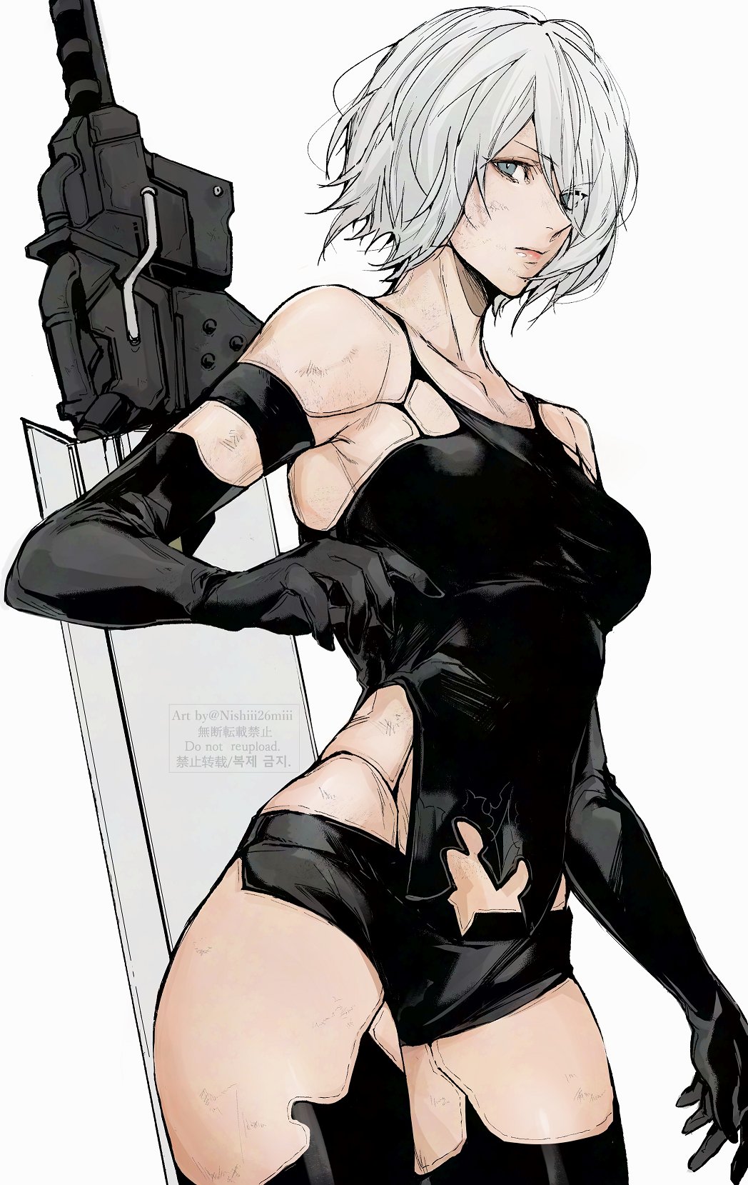 1girl a2_(nier:automata) android armband bare_shoulders breasts closed_mouth collarbone cowboy_shot floating floating_object floating_sword floating_weapon gloves greatsword highres looking_at_viewer medium_breasts nier:automata nier_(series) nishiii26miii short_hair sword thighs weapon white_hair