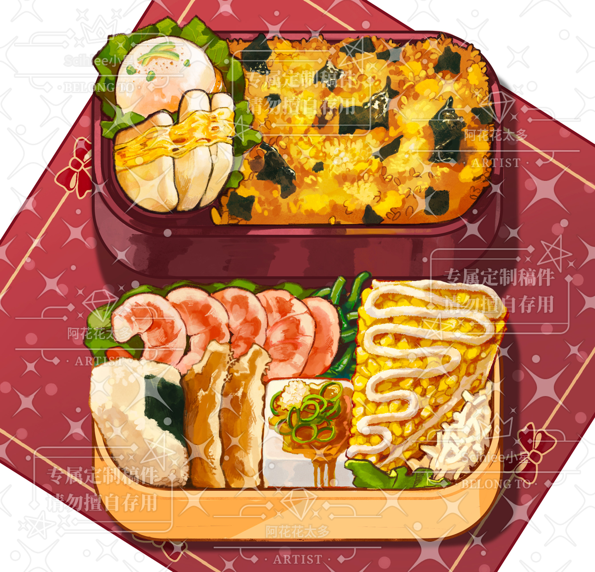 bento bluebluecathy cake cake_slice commentary_request food food_focus food_request fried_rice no_humans onigiri original shrimp watermark