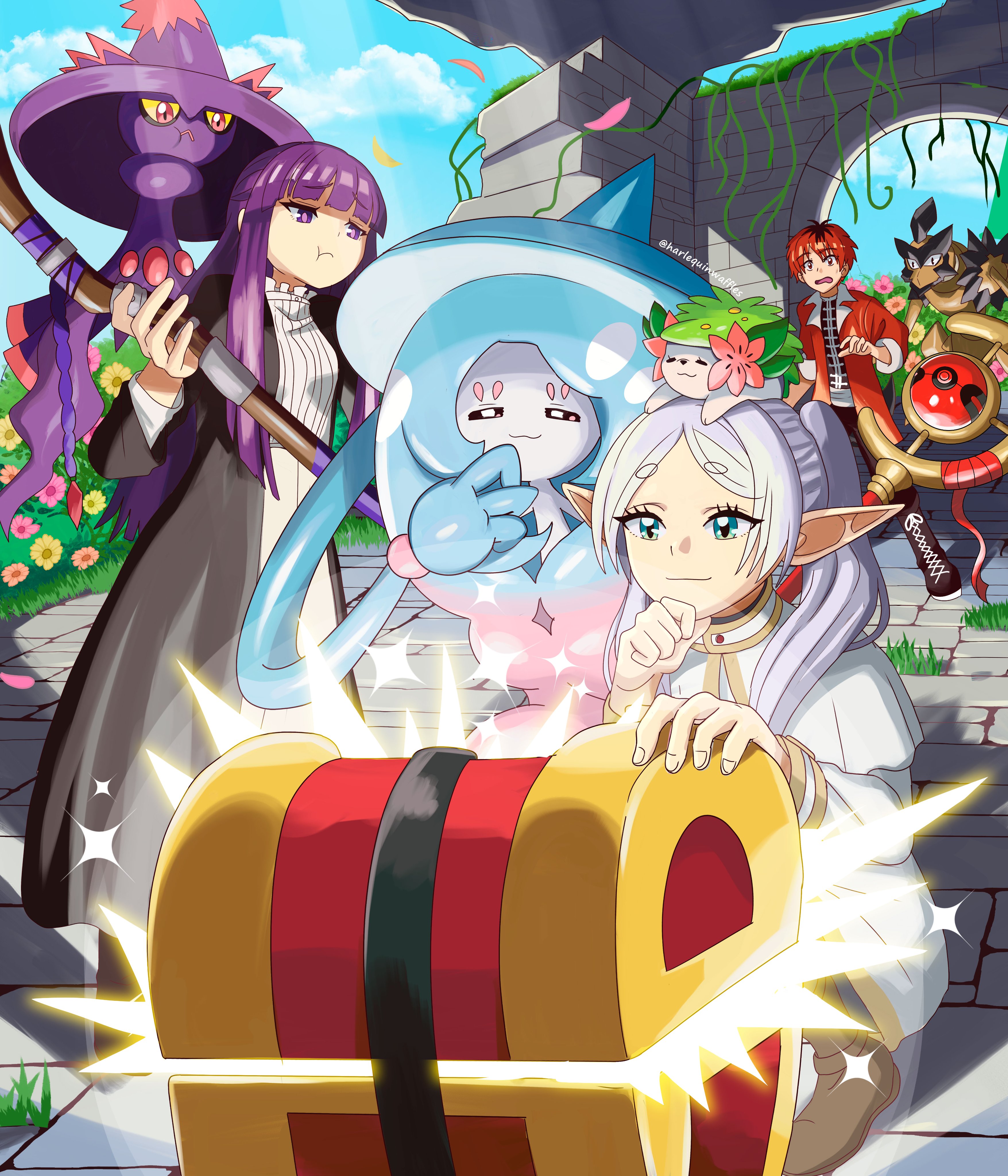 absurdres capelet crossover earrings elf fern_(sousou_no_frieren) floating_earrings frieren gen_4_pokemon gen_8_pokemon gimmighoul gimmighoul_(chest) harlequinwaffles hatterene highres jewelry legendary_pokemon mage_staff mismagius mythical_pokemon nintendo pointy_ears pokemon pokemon_(creature) shaymin shaymin_(land) sousou_no_frieren staff stark_(sousou_no_frieren) teardrop_earrings white_capelet