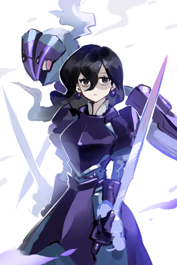 1girl alternate_costume armor bags_under_eyes black_hair bodice bright_pupils ceruledge commentary earrings fiery_hair fire flaming_eyes flaming_sword flaming_weapon hair_between_eyes helmet hex_maniac_(pokemon) hex_maniac_(pokemon_legends:_z-a) high_collar holding holding_sword holding_weapon jewelry long_hair nintendo pokemon pokemon_(creature) pokemon_legends:_z-a purple_armor purple_eyes purple_fire purple_helmet raine_(acke2445) shoulder_armor sphere_earrings sword untranslatable_commentary weapon