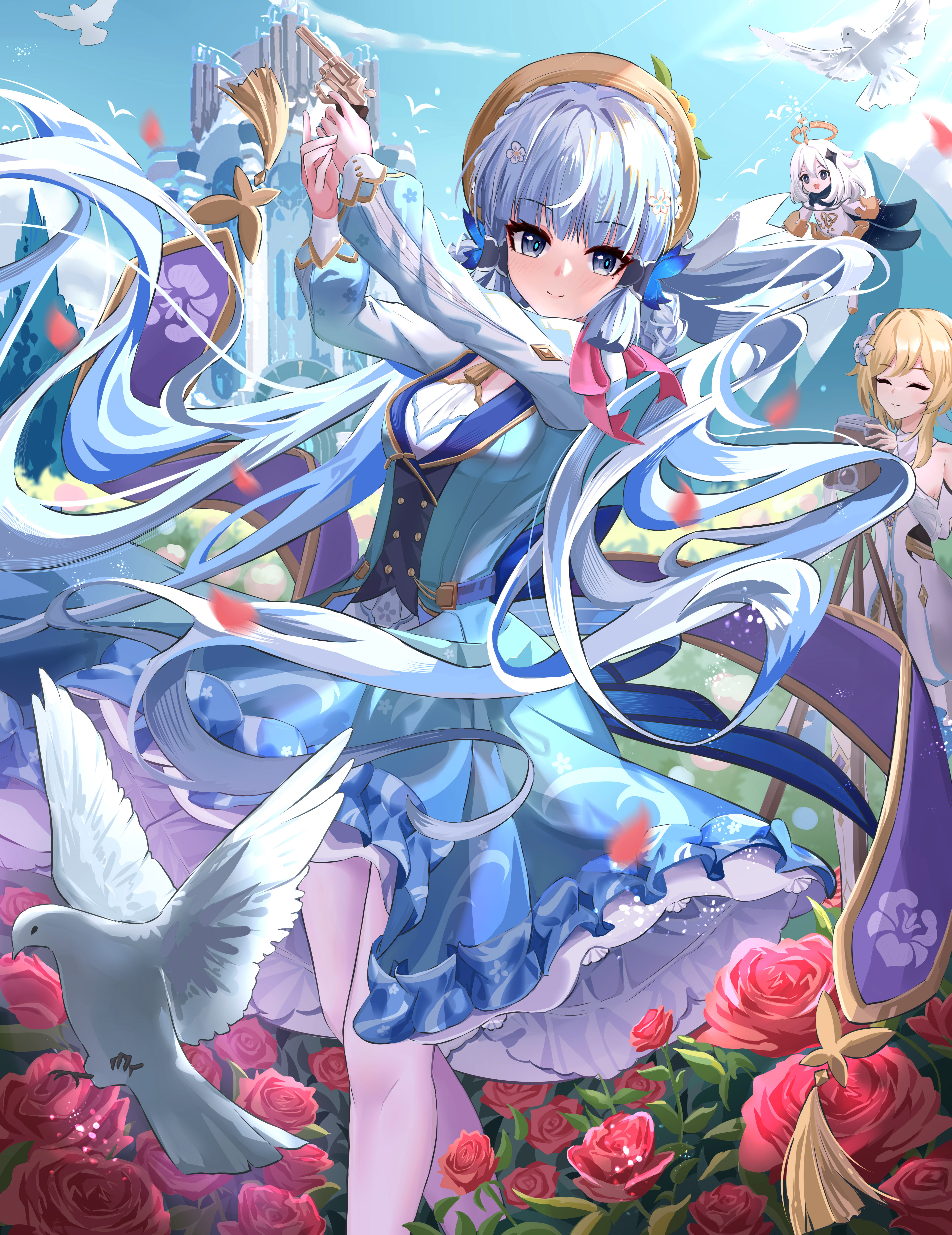 3girls ^_^ absurdres aichinaigai arms_up ayaka_(genshin_impact) bird black_cape blonde_hair blue_dress blue_eyes blue_hair breasts camera cape closed_eyes closed_mouth commentary_request day dress floating flower genshin_impact gun hair_ornament halo highres holding holding_gun holding_weapon kamisato_ayaka kamisato_ayaka_(springbloom_missive) long_hair long_sleeves looking_to_the_side lumine_(genshin_impact) medium_breasts multiple_girls official_alternate_costume outdoors paimon_(genshin_impact) pantyhose red_flower romper rose short_hair_with_long_locks simple_background smile solo_focus standing star_(symbol) star_hair_ornament triquetra very_long_hair weapon white_bird white_pantyhose white_romper
