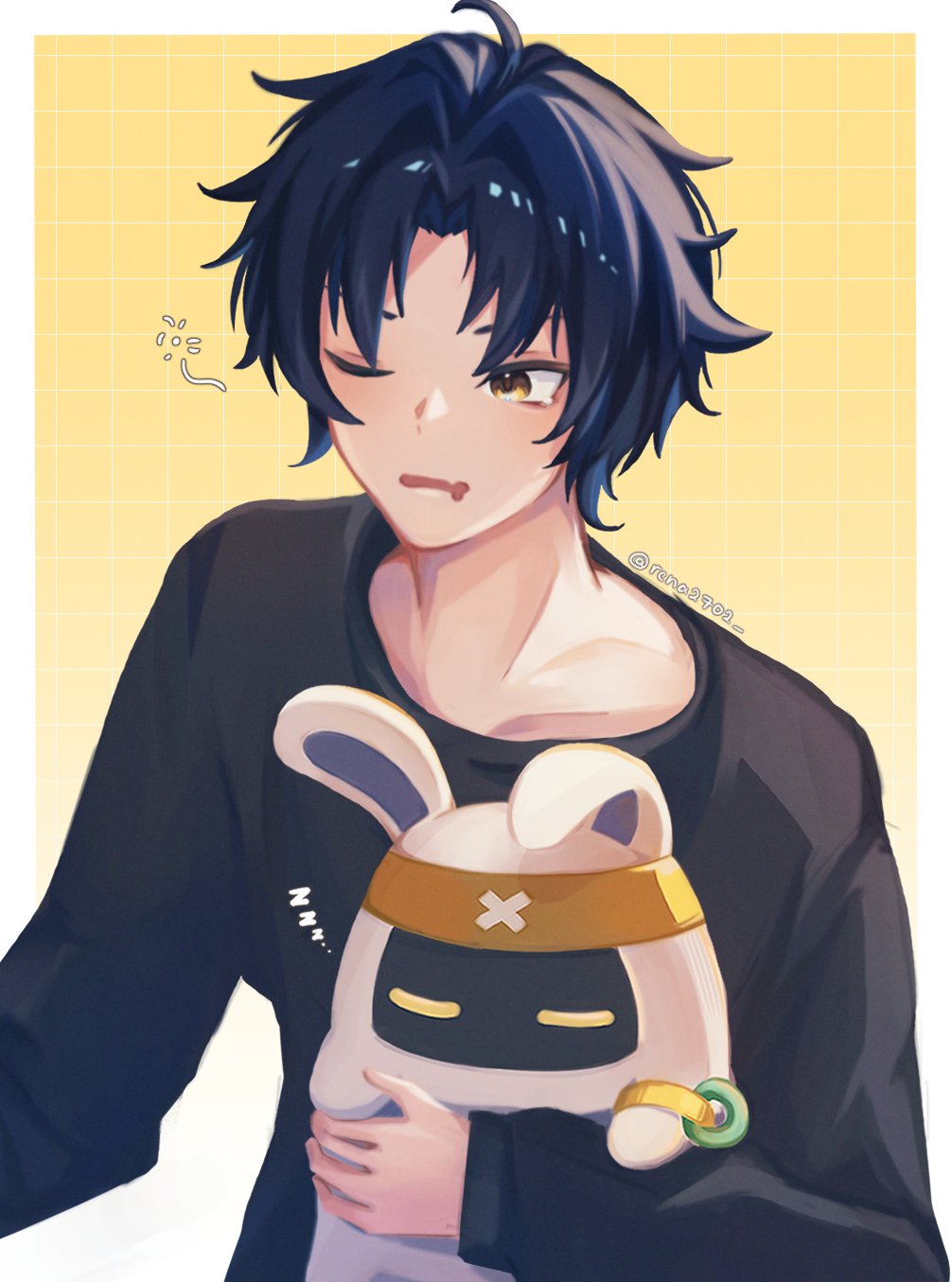 1boy asaba_harumasa asaboo_(zenless_zone_zero) black_hair black_shirt border highres holding holding_stuffed_toy long_sleeves male_focus one_eye_closed open_mouth rena2702 shirt short_hair solo stuffed_toy tears white_border yellow_eyes zenless_zone_zero