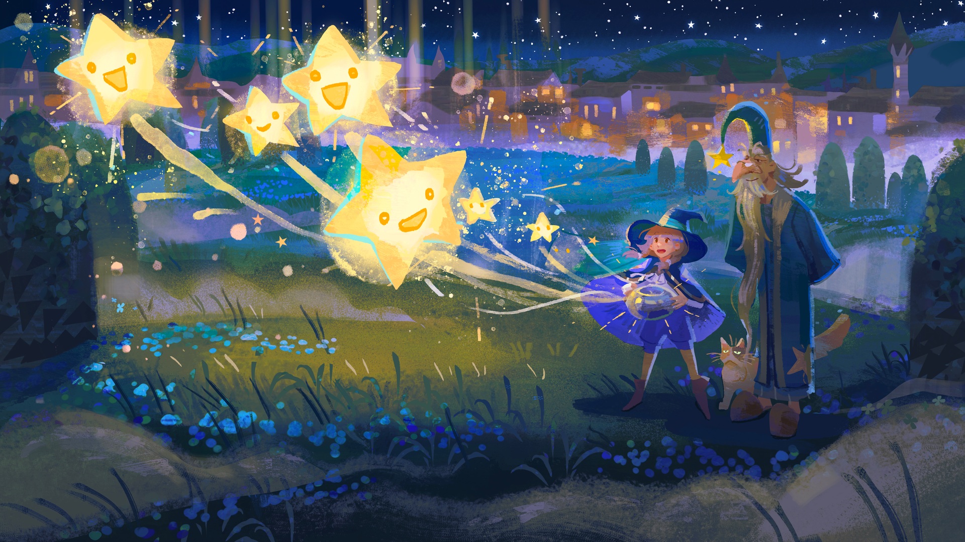 1girl beard blue_flower boots cat city_lights facial_hair flower foliage glasses grass grey_hair hat highres jenishiiarts light_particles long_beard long_sleeves night old old_man original outdoors pink_hair plant robe shorts sky slippers smile standing star_(sky) star_(symbol) tree very_long_beard witch witch_hat wizard wizard_hat