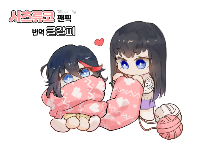 2girls blue_eyes chibi jibek_lily kill_la_kill kiryuuin_satsuki knitting knitting_needle long_hair matoi_ryuuko multiple_girls needle scarf siblings sisters sitting yarn