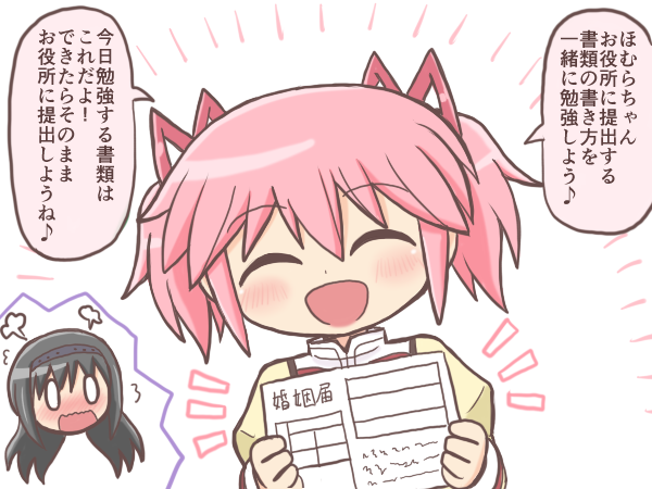 0_0 2girls :d ^_^ akemi_homura bad_id bad_pixiv_id black_hair blush closed_eyes commentary_request facing_viewer hair_ribbon holding holding_paper kaname_madoka long_hair mahou_shoujo_madoka_magica marriage_certificate_(object) mitakihara_school_uniform multiple_girls notice_lines open_mouth paper pink_hair puff_of_air reverse_(bluefencer) ribbon school_uniform short_hair short_twintails smile solo_focus speech_bubble translation_request twintails upper_body yuri