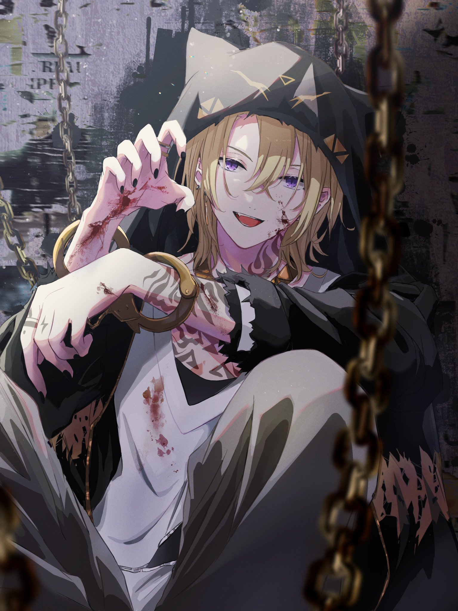 1boy arm_tattoo arm_up black_jacket black_nails blonde_hair blood blood_on_clothes bracelet chain chest_tattoo claw_pose commentary grey_pants hair_between_eyes highres hood hood_up jacket jewelry long_sleeves looking_at_viewer luca_kaneshiro luca_kaneshiro_(3rd_costume) male_focus nail_polish neck_tattoo nijisanji nijisanji_en open_mouth pants purple_eyes s_mizuki666 shirt sitting solo tattoo teeth tongue upper_teeth_only v-neck virtual_youtuber white_shirt