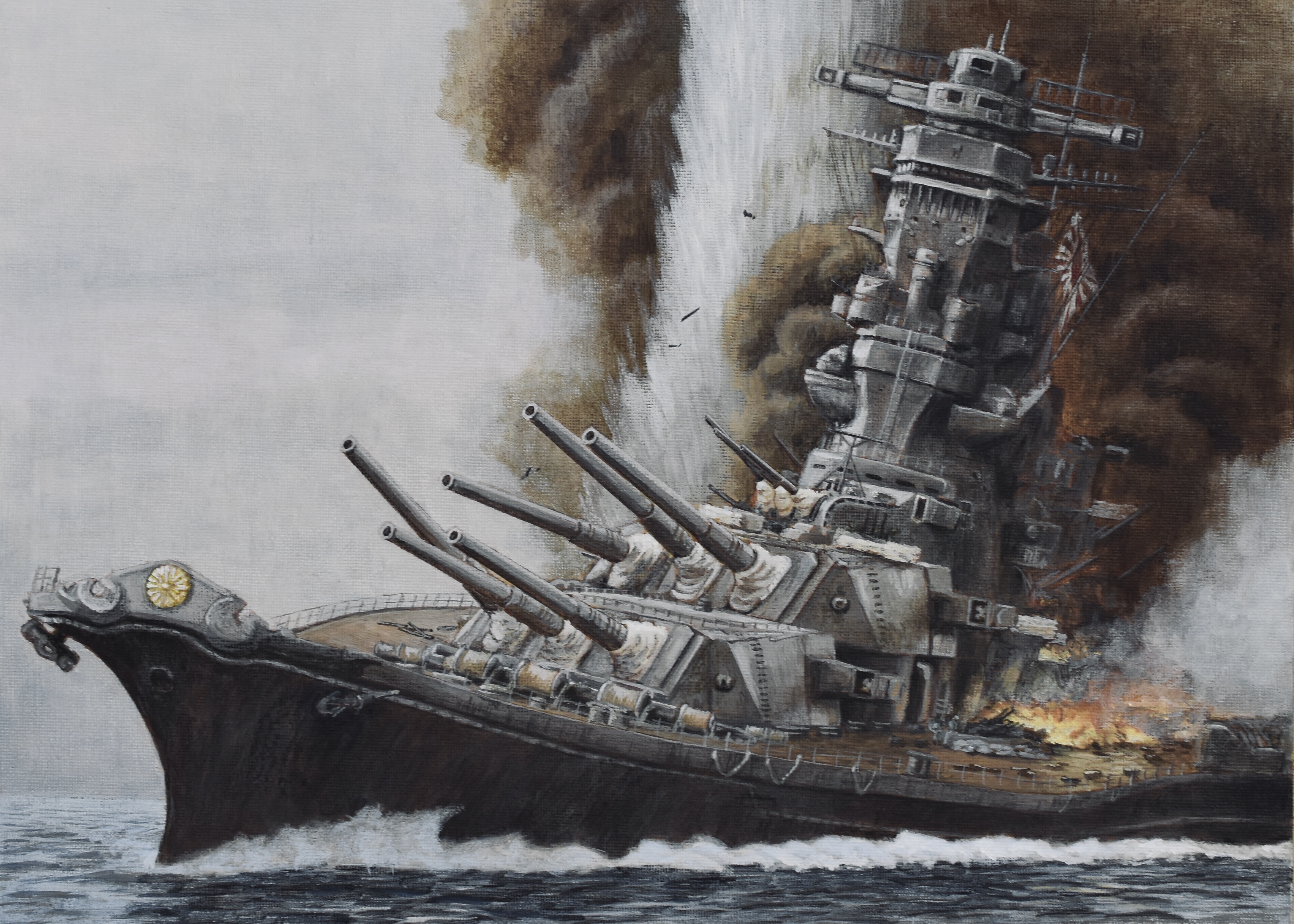absurdres acrylic_paint_(medium) atelier_bono battleship cannon cloud cloudy_sky explosion fire flag highres historical_event imperial_japanese_navy military_vehicle no_humans ocean operation_ten-gou original painting_(medium) ship ship_turret sinking sky smoke smokestack traditional_media vehicle_focus warship watercraft waves world_war_ii yamato_(battleship)