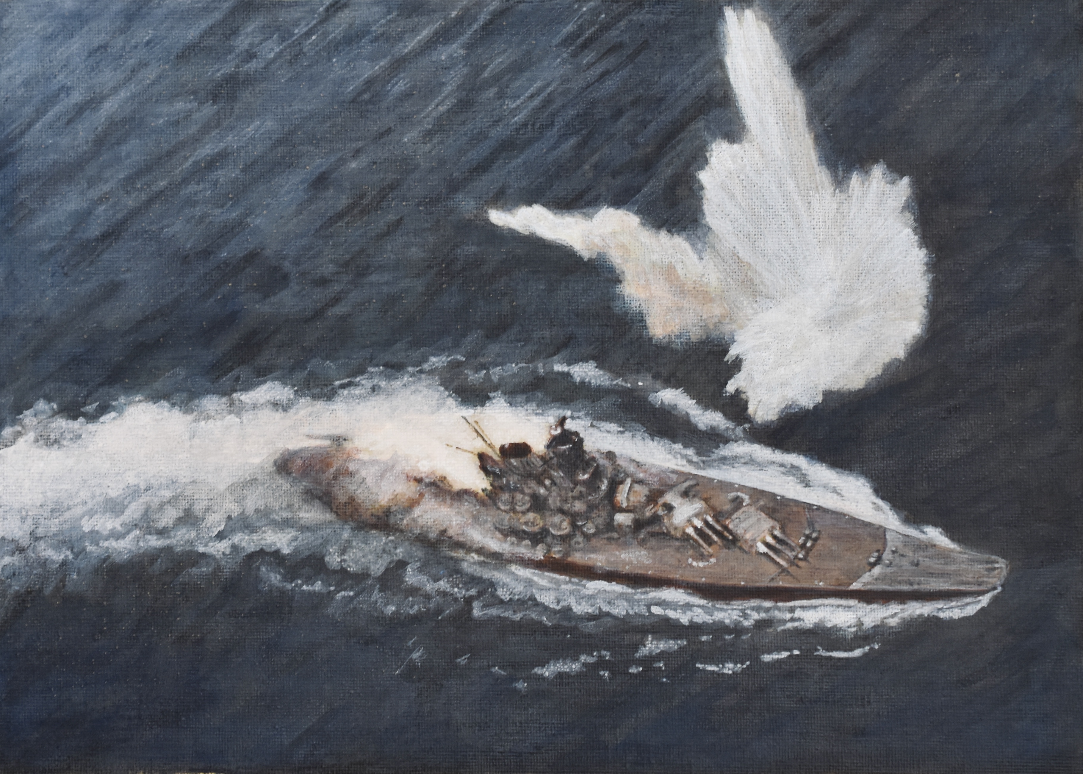 absurdres acrylic_paint_(medium) atelier_bono battleship cannon explosion fire from_above highres historical_event imperial_japanese_navy military_vehicle no_humans ocean operation_ten-gou original painting_(medium) photo-referenced ship ship_turret smoke smokestack traditional_media vehicle_focus warship watercraft waves world_war_ii yamato_(battleship)