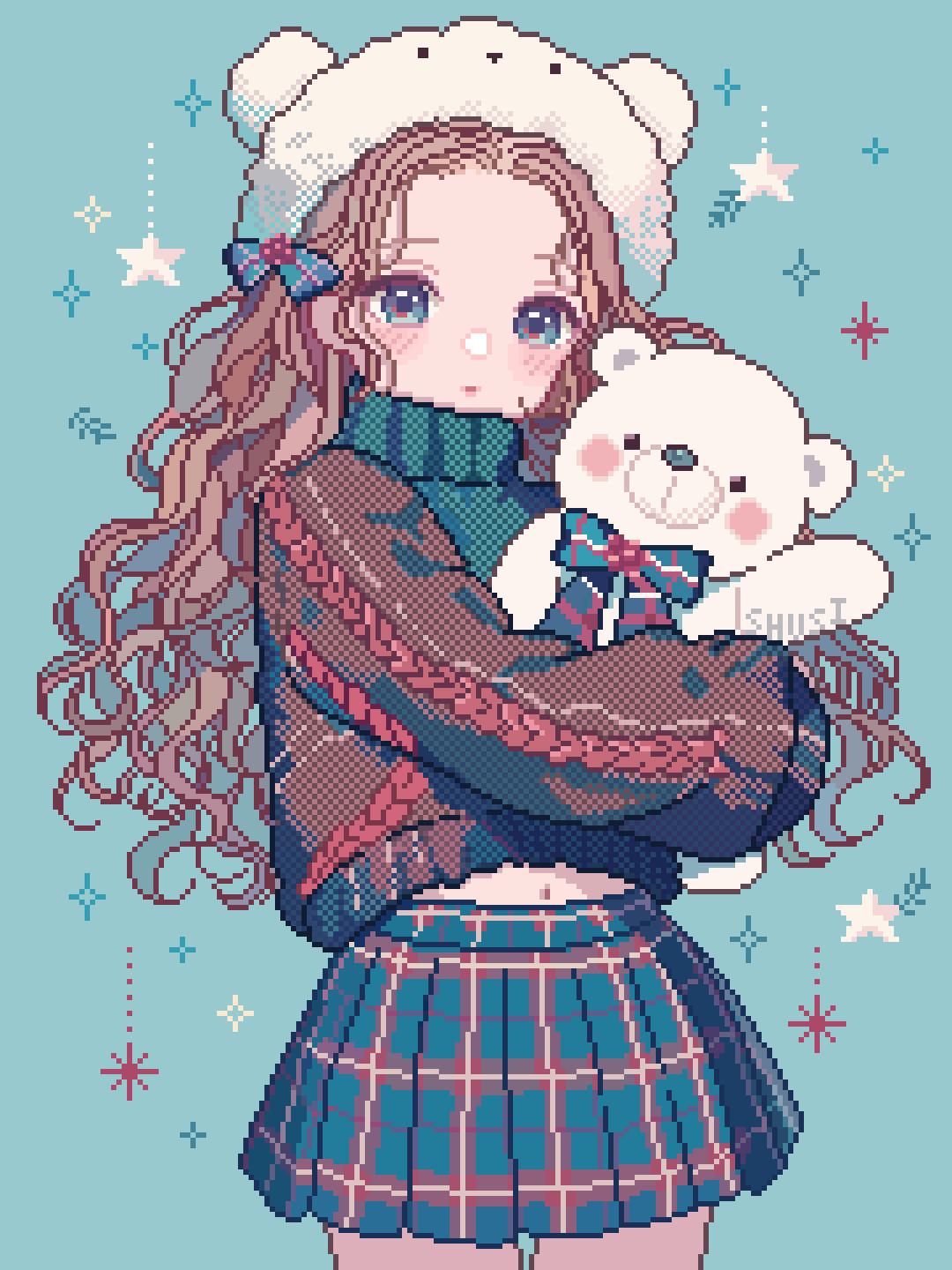 1girl animal_hat artist_name blue_background blush brown_cardigan brown_hair cardigan closed_mouth cowboy_shot green_eyes green_sweater hair_ornament hat highres looking_at_viewer original pixel_art pleated_skirt shusi_(6muuu3) skirt solo star_(symbol) stuffed_animal stuffed_toy sweater teddy_bear wavy_hair white_hat