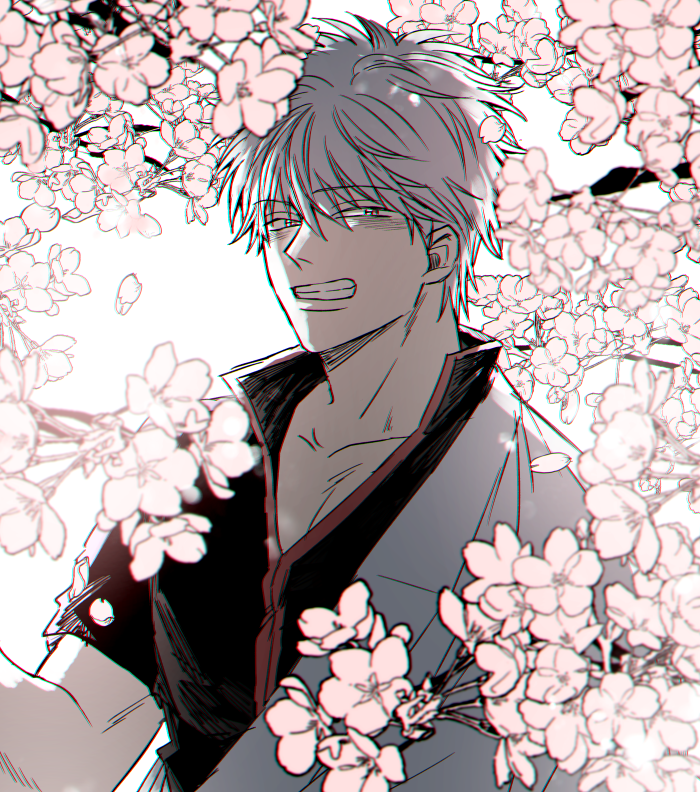 1boy black_shirt cherry_blossoms gintama grey_hair grin high_collar japanese_clothes kimono looking_at_viewer male_focus messy_hair sakata_gintoki sakurana shirt short_sleeves smile solo_focus teeth upper_body white_background white_kimono