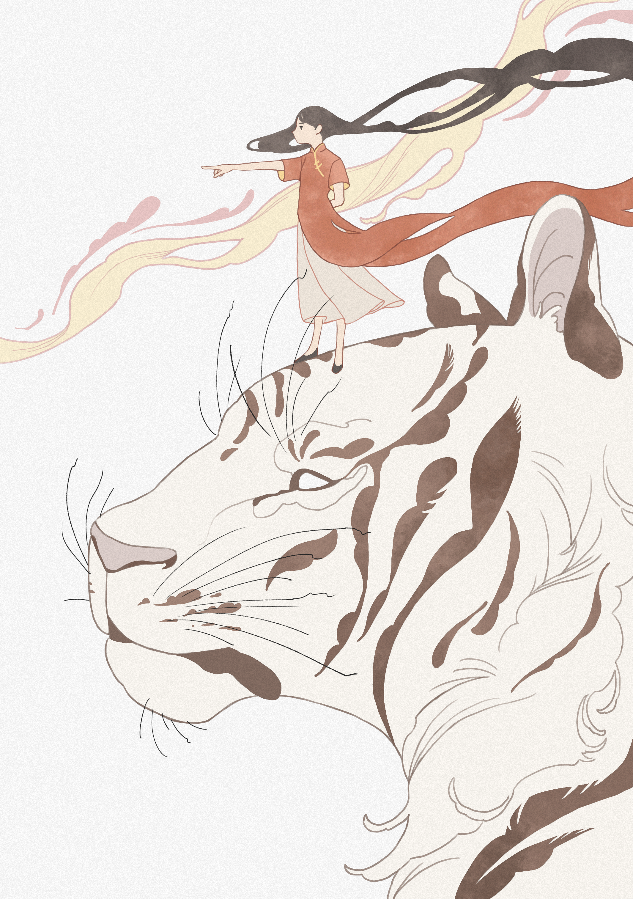 1girl absurdly_long_hair absurdres black_hair black_shoes china_dress chinese_clothes commentary_request dress floating_hair grey_background highres long_hair looking_to_the_side on_animal original pointing red_dress shoes short_sleeves skirt standing surie tiger very_long_hair white_eyes white_skirt white_tiger