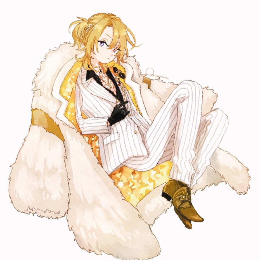 1boy black_gloves black_shirt blonde_hair blue_eyes brown_shoes closed_mouth coat coat_on_shoulders collared_shirt commentary curtained_hair dot_nose dress_shoes formal_clothes fur_coat gloves hashtag-only_commentary kurumission lapels long_sleeves looking_at_viewer luca_kaneshiro luca_kaneshiro_(1st_costume) male_focus multicolored_coat nijisanji nijisanji_en notched_lapels pants pinstripe_pants pinstripe_pattern pinstripe_suit ponytail shirt shoes solo suit two-tone_coat virtual_youtuber white_background white_coat white_pants white_suit wing_collar